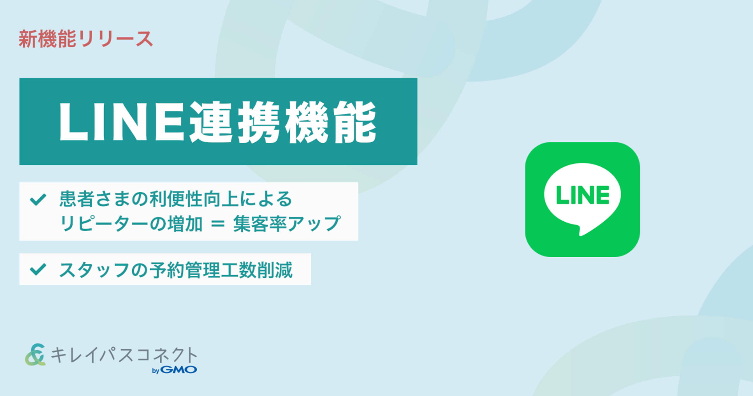 そこで「キレイパスコネクト byGMO」では「LINE」との連携により、シームレスな予約フローの構築による集客率アップ、患者さまの利便性の向上、予約情報の自動登録による管理工数の削減に繋がると考え、本機能のリリースに至りました。
