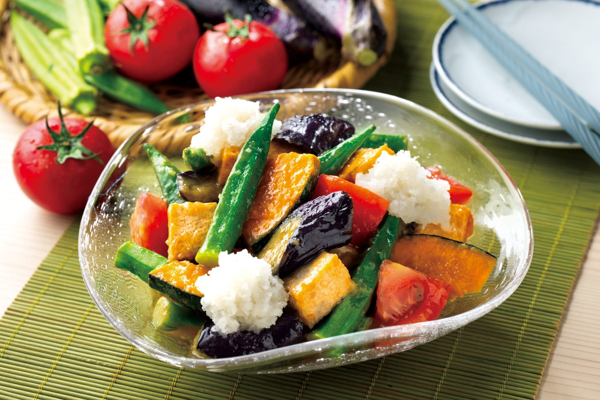 なす、トマト、おくら、かぼちゃの夏野菜と豆腐を生姜がきいたタレでみぞれ和えに仕立てました。