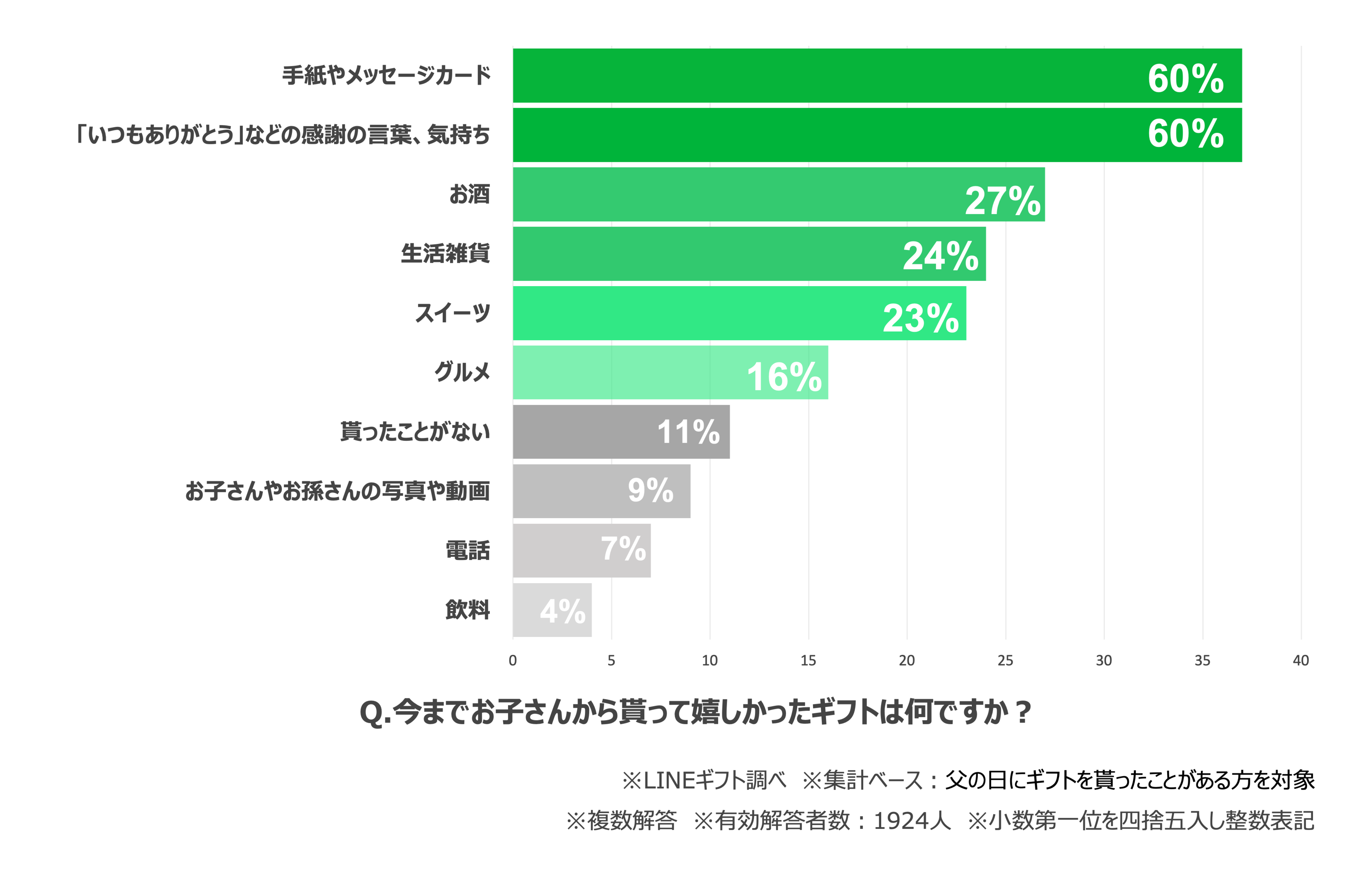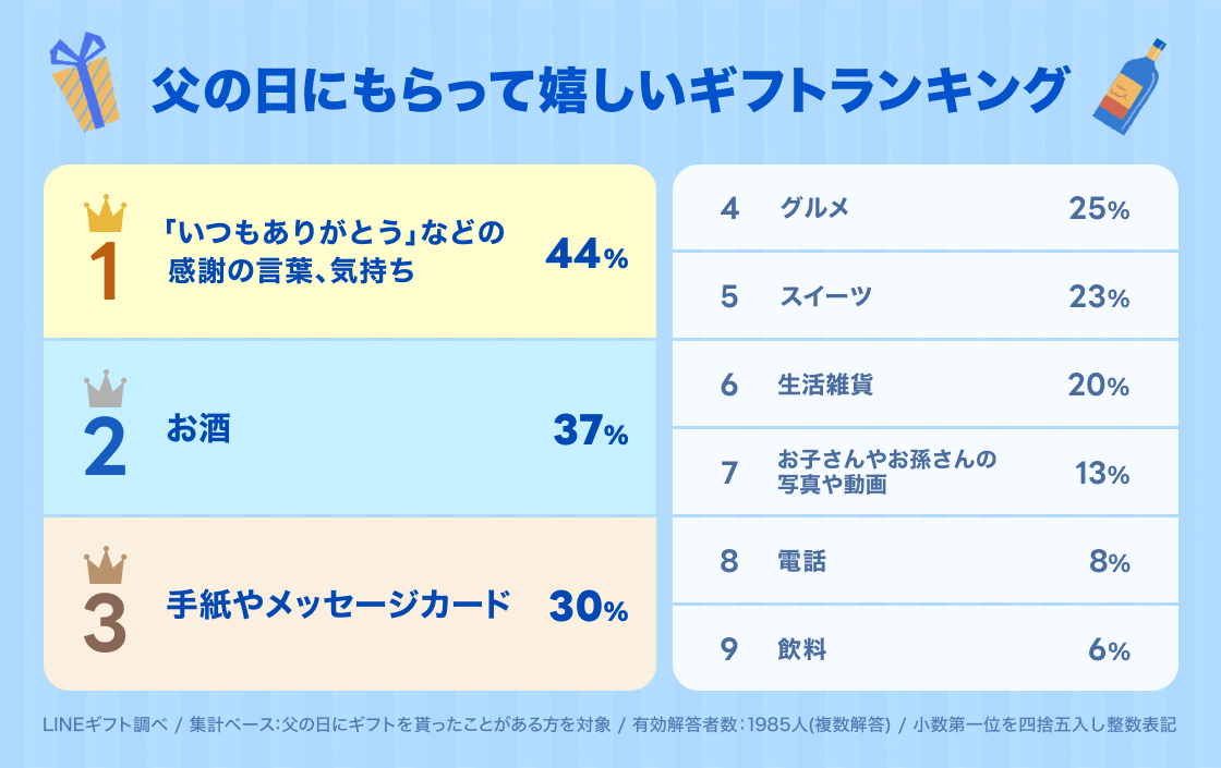 ■今年の父の日にもらって嬉しいギフトは「感謝の言葉・気持ち」「お酒」「手紙やメッセージカード」が上位に!LINEギフトで調査した「父の日ギフト」最新ランキングを公開!