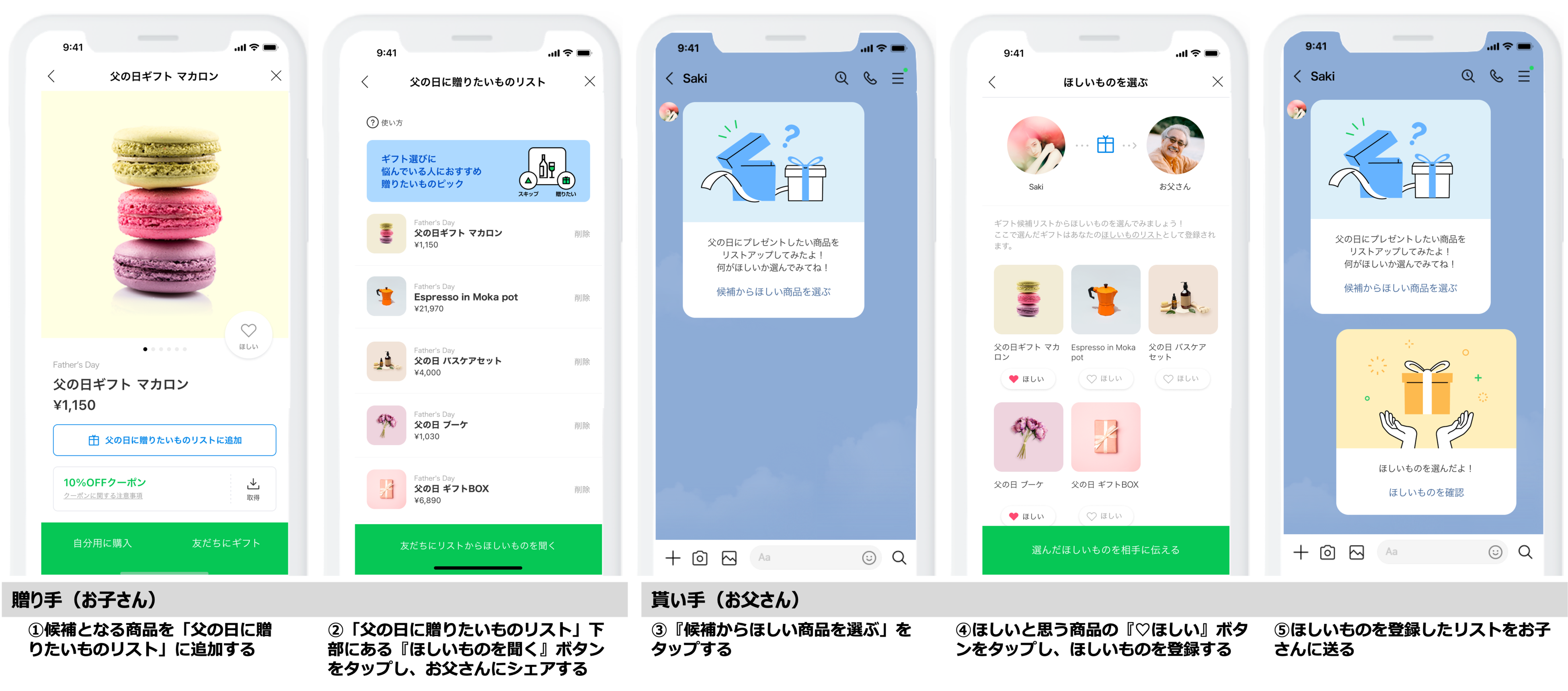 「父の日に贈りたいものリスト」は、贈りたいギフト候補を選定しリストとしてストックすることができる期間限定の機能です。「何を贈るか決めきれない!」「お父さんが欲しいものを事前に知りたい!」という方にぴったりの機能で、気軽にお父さんに欲しいものを聞くこともできます。LINEのトークでお父さんにリストをシェアし、その中からほしいものを選んでもらうことができるため、絶対にハズさないギフトを贈ることができ、お父さんとのコミュニケーションを取り合うきっかけにもつながります。