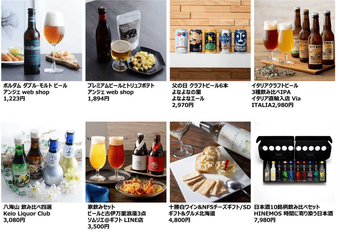 LINEギフトにおける昨年の父の日ギフトでは、「お酒ギフト」の人気が最も高く、中でも色々な味を楽しめる「ビール飲み比べセット」、いつものビールよりも特別感が得られる「ご当地ビールや海外ビール」、お家飲みを充実させる「ちょっとしたおつまみ+お酒セット」の需要が高い傾向がみられました。