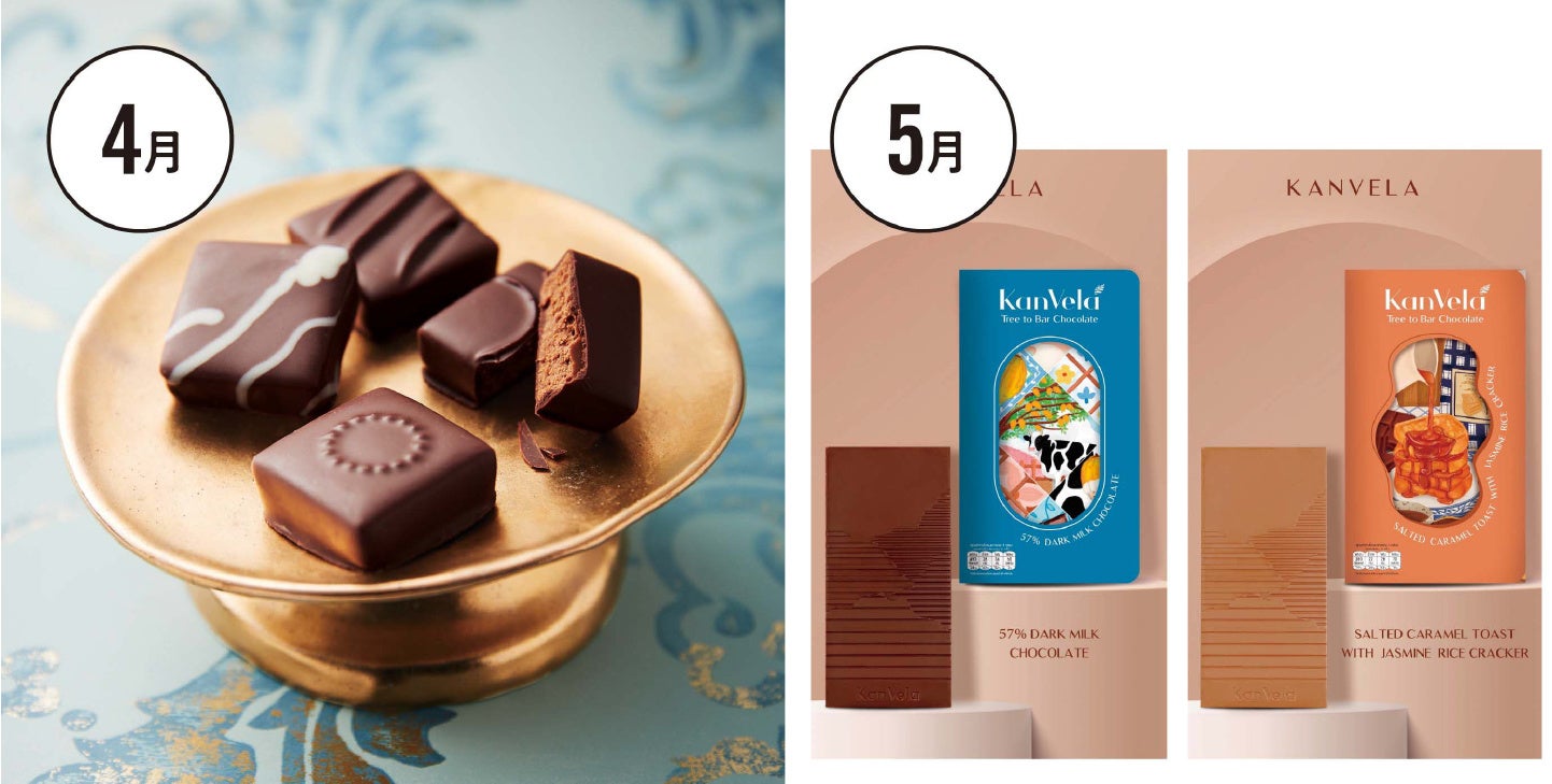 今、アジアのチョコレートが注目されています。 その代表格が、タイの「カンヴェラ」です。自社農園でカカオを栽培し、持続可能な方法でチョコ作りを行っています。クオリティーの高さはもちろん、オリジナリティー溢れる製品が魅力です。お届けする板チョコ、クッキー、ボンボンなど、どれもパーフェクトな仕上がりです。チョコの未来をすぐそばに感じられる6ヵ月を、ぜひ楽しんでみてください。