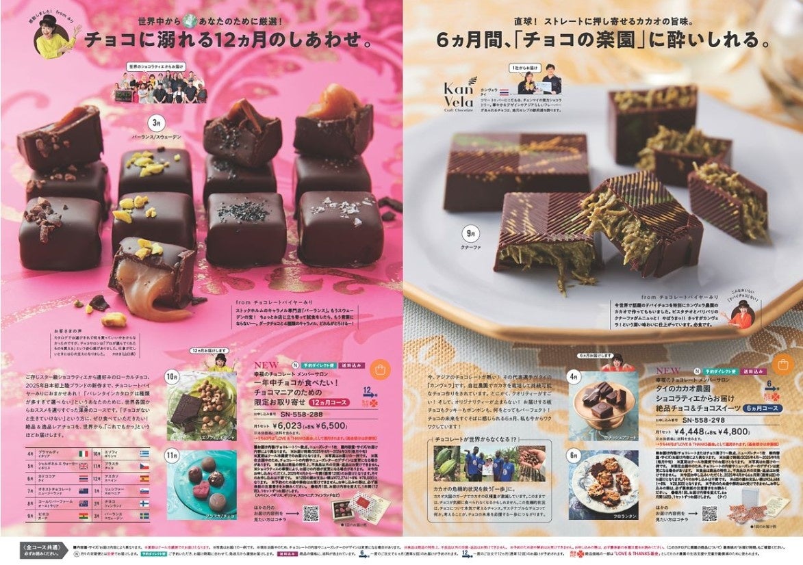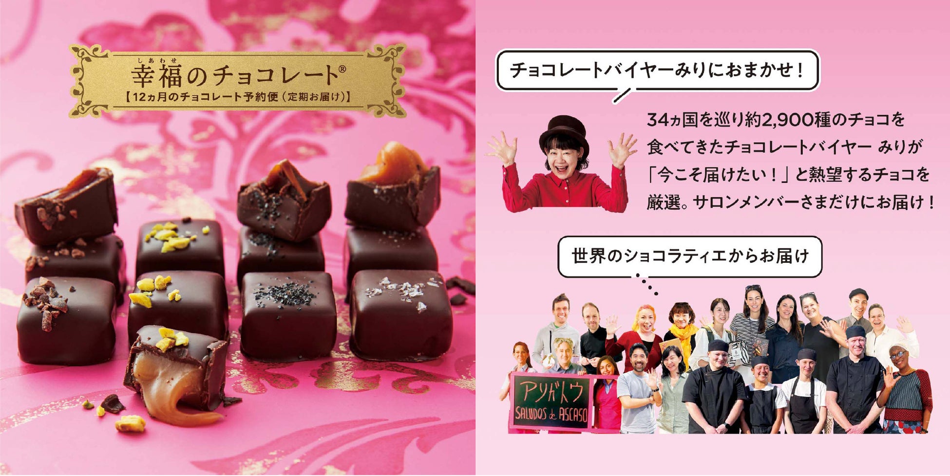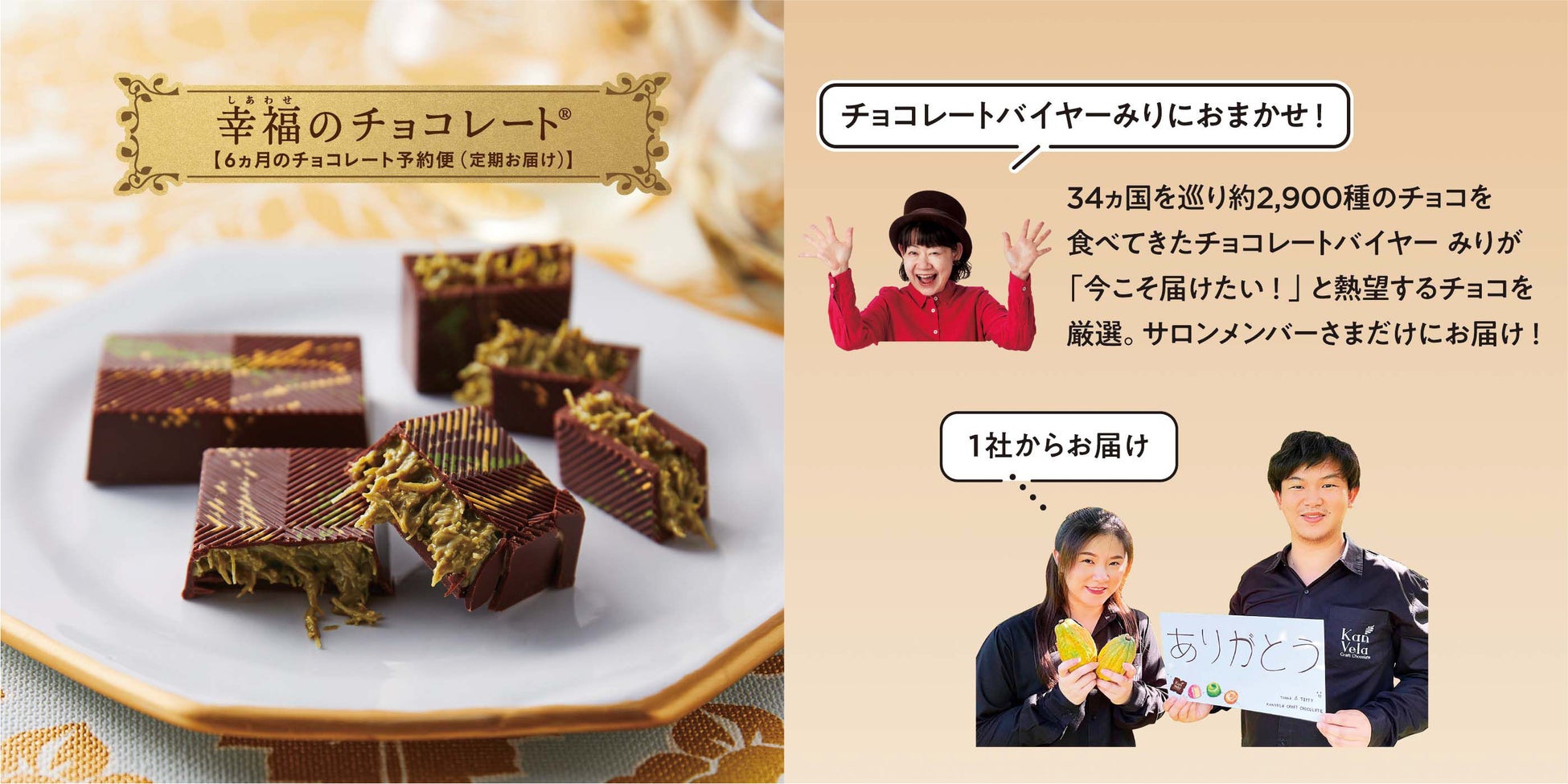 フェリシモが展開する、希少な海外プレミアムチョコレートの専門カタログ・ウェブサイト「幸福(しあわせ)のチョコレート(R)」は、“オンラインセミナー”と“チョコの予約便(定期お届け)”がセットになった「幸福のチョコレートメンバーサロン」第5期メンバーの募集を12月25日より開始しています。チョコ愛にまみれる6ヵ月と12ヵ月の2つのコースがあり、チョコレートバイヤーみりが世界中から探し出したストーリーある海外ローカルチョコが毎月届きます。読みながらチョコを食べれば美味しさが倍増する、チョコレートバイヤーみりの語りや写真付きニューズレターも一緒に届くので、まるで旅先からチョコが届いたような気分が味わえます。さらにインスタライブ形式でサロンメンバーへ詳しい解説を毎月配信します。「一年中チョコを食べたい」というチョコマニアのためのお取り寄せです。予約申し込みの締め切りは3月2日、チョコレートのお届け開始は4月中旬からです。掲載されているすべてのチョコの販売価格には、約1%の「LOVE & THANKS基金」付きで、カカオの生産地ガーナの児童労働をなくす活動に拠出されます。詳細はデジタルカタログと特設サイトでチェックできます。