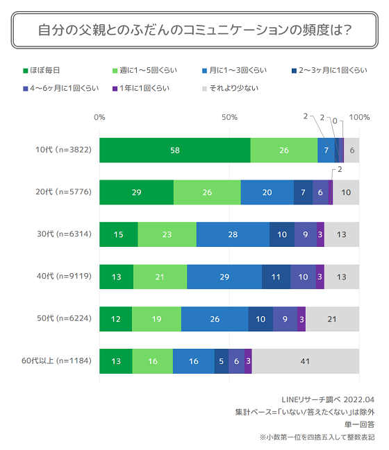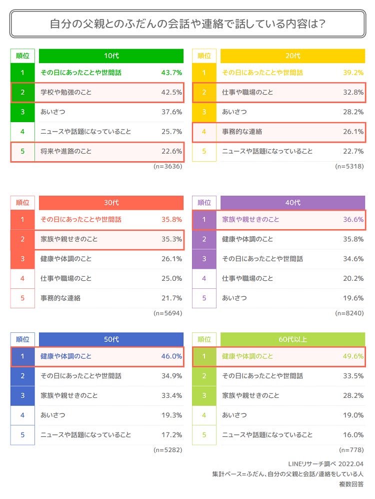 母親と話している内容( https://research-platform.line.me/archives/40002001.html#5 )と比べてみると、全体1位は同様の傾向でしたが、10代ではやや違いがみられました。学校や勉強、将来や進路のことの他に、母親とは「友だちや人間関係のこと」、父親とは「あいさつ」、「ニュースや話題になっていること」などを話す割合が高いようです。20代以上では、母親と父親との話している内容に大きな差はみられませんでした。