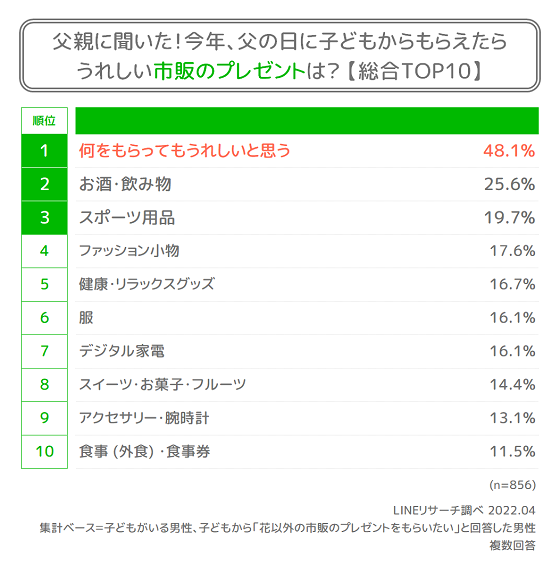 【LINEリサーチ】父の日にもらいたい市販のプレゼントは、「何をもらってもうれしい」「お酒・飲み物」「スポーツ用品」が上位 父親とのコミュニケーションの頻度は「ほぼ毎日」が全体で2割超