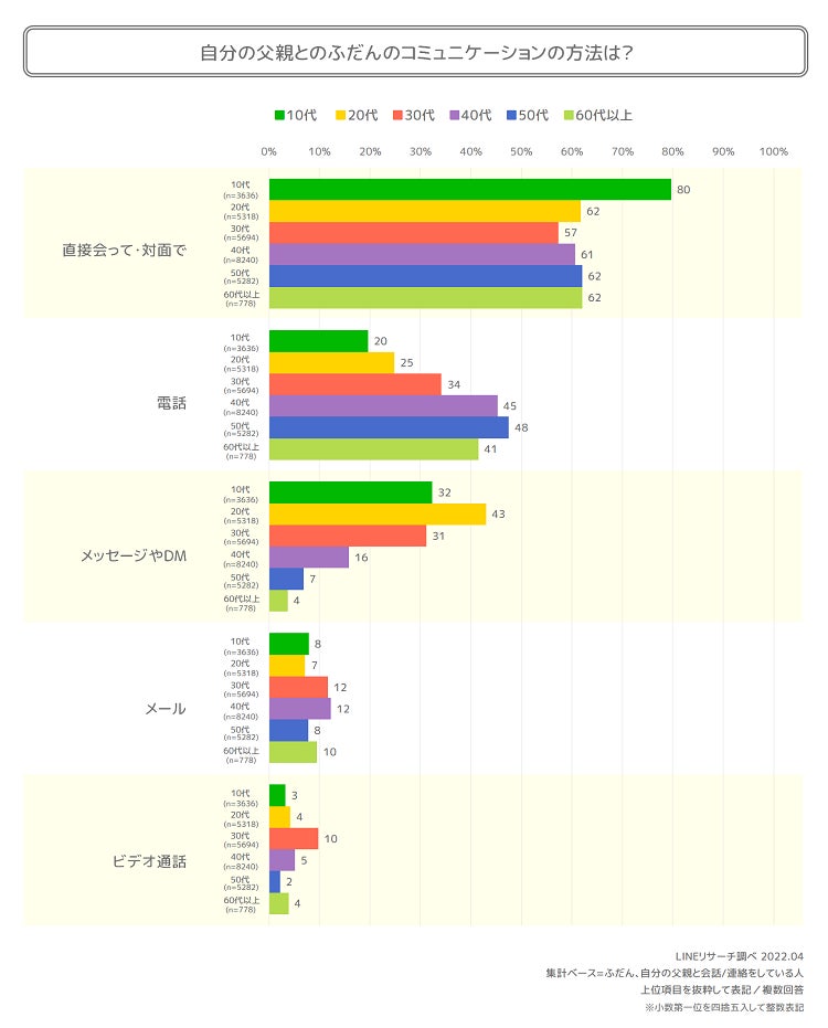 前項で、ふだん父親と会話/連絡をしていると回答した人に、どのような方法でコミュニケーションを取っているのか聞いてみました。今回は上位項目を抜粋してご紹介します。