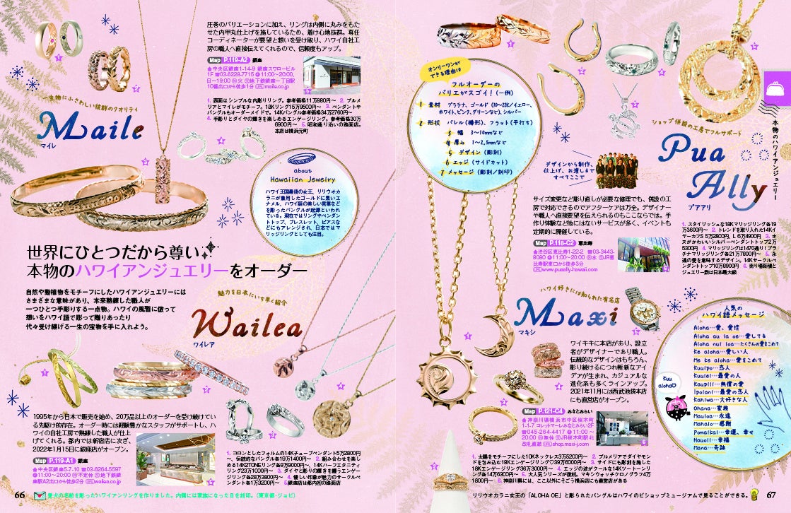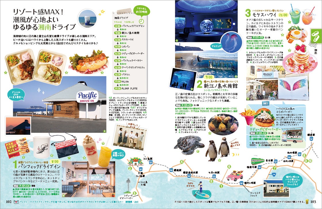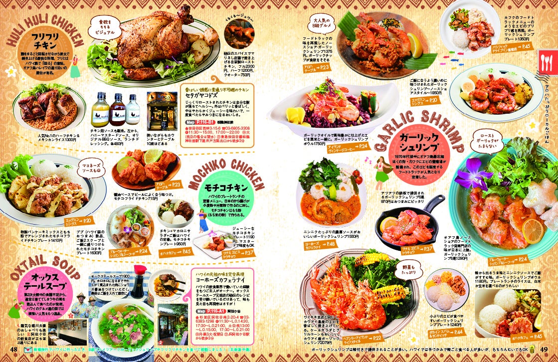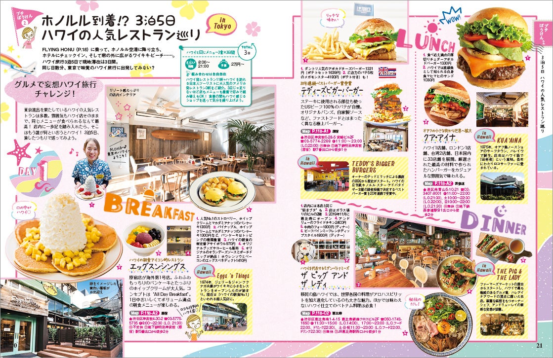 巻頭プチぼうけんプランでは、3泊5日の妄想ハワイトリップへ出発! ハワイ発レストラン11軒&ハワイで人気のアメリカンレストラン3軒の合計14軒を、aruco的おすすめプランで巡ります。東京店限定メニューやハワイ店舗情報もあわせてチェック!