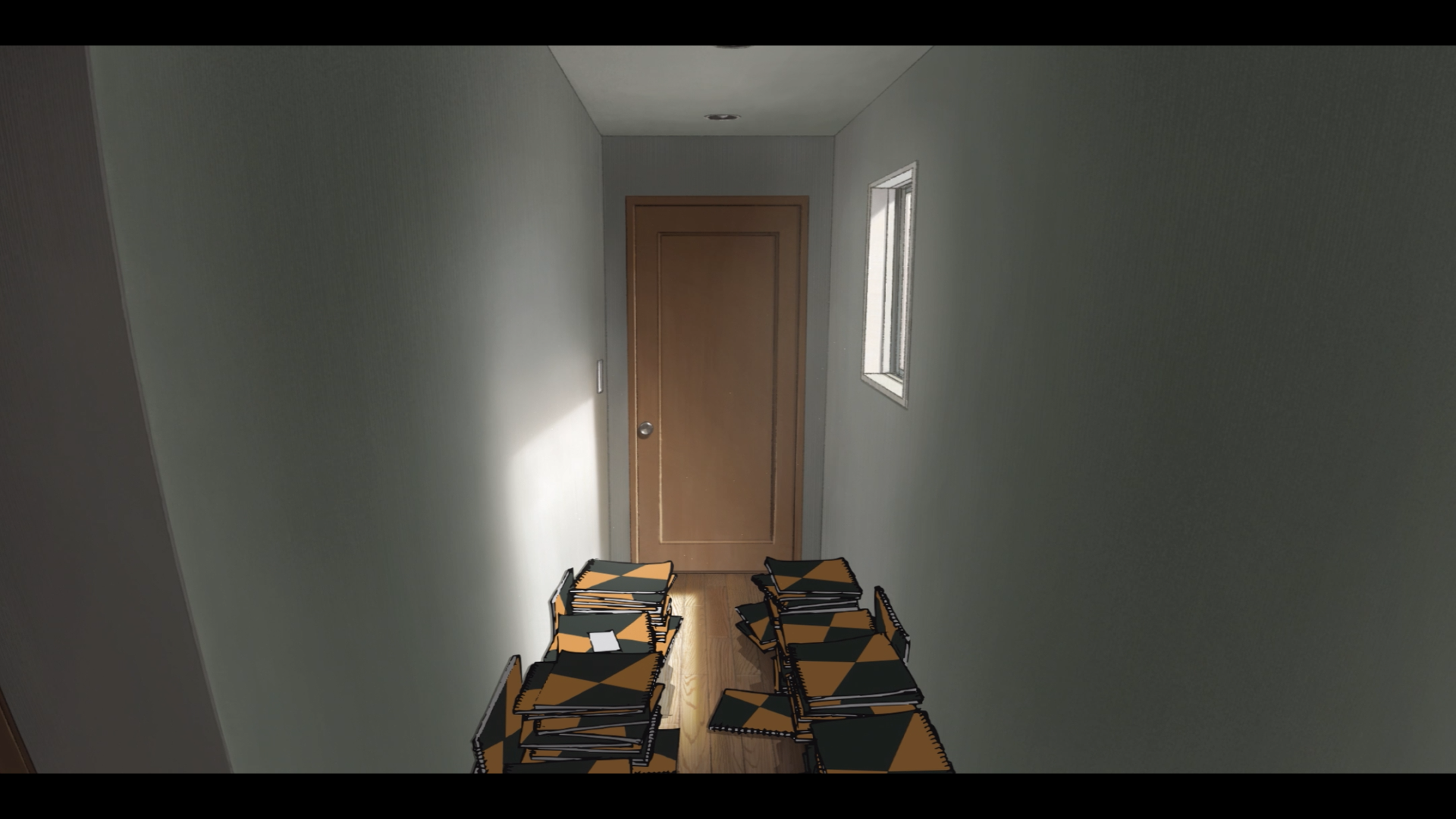2人が制作活動を共にした藤野の部屋、さらに京本の部屋に続くスケッチブックが積みあがった廊下が