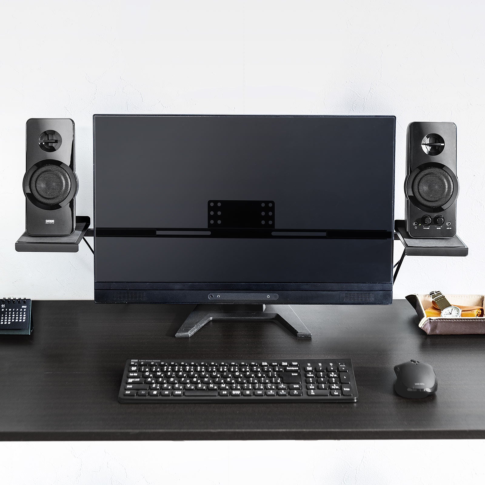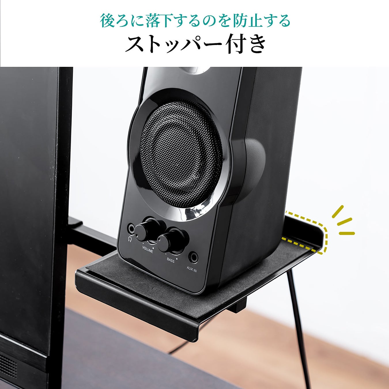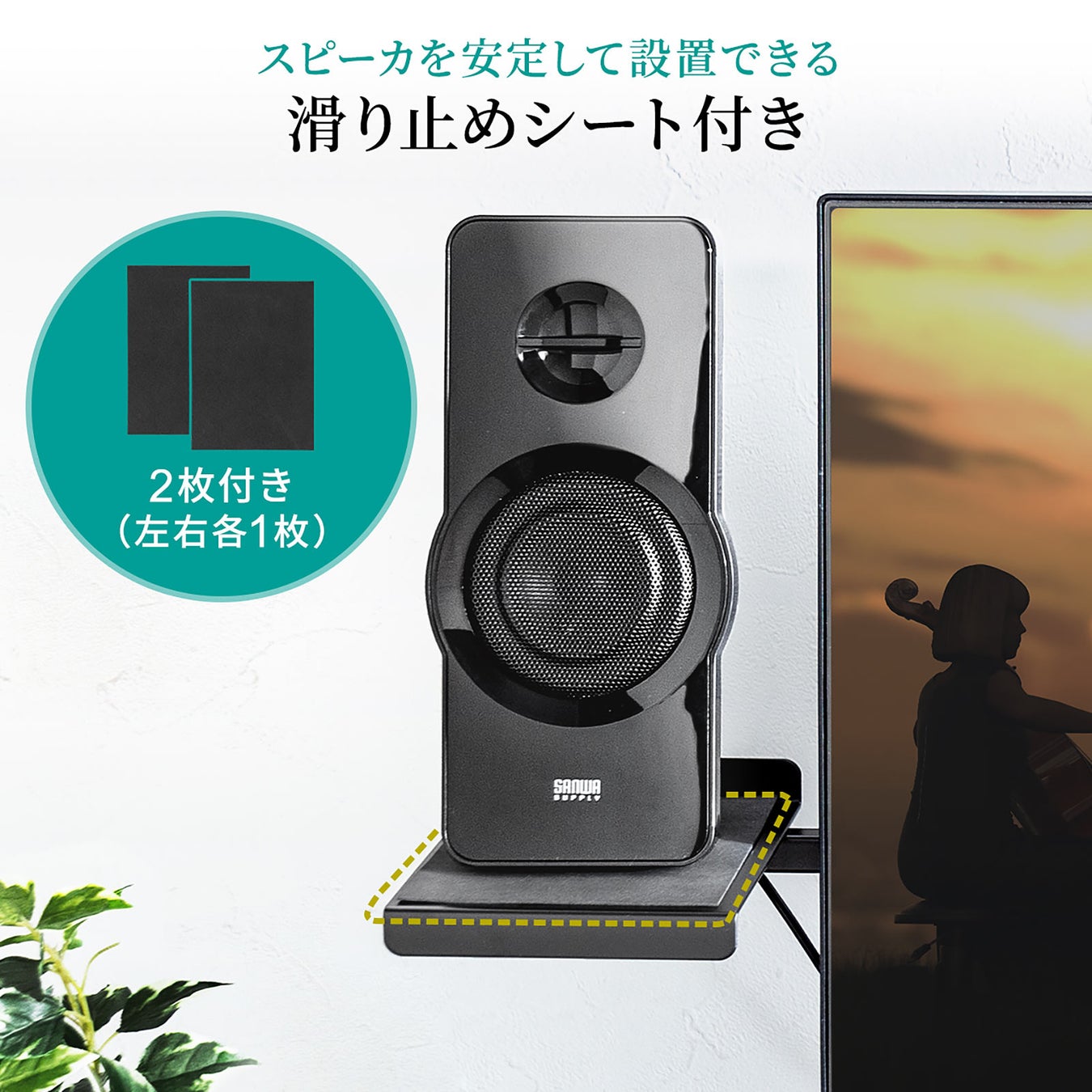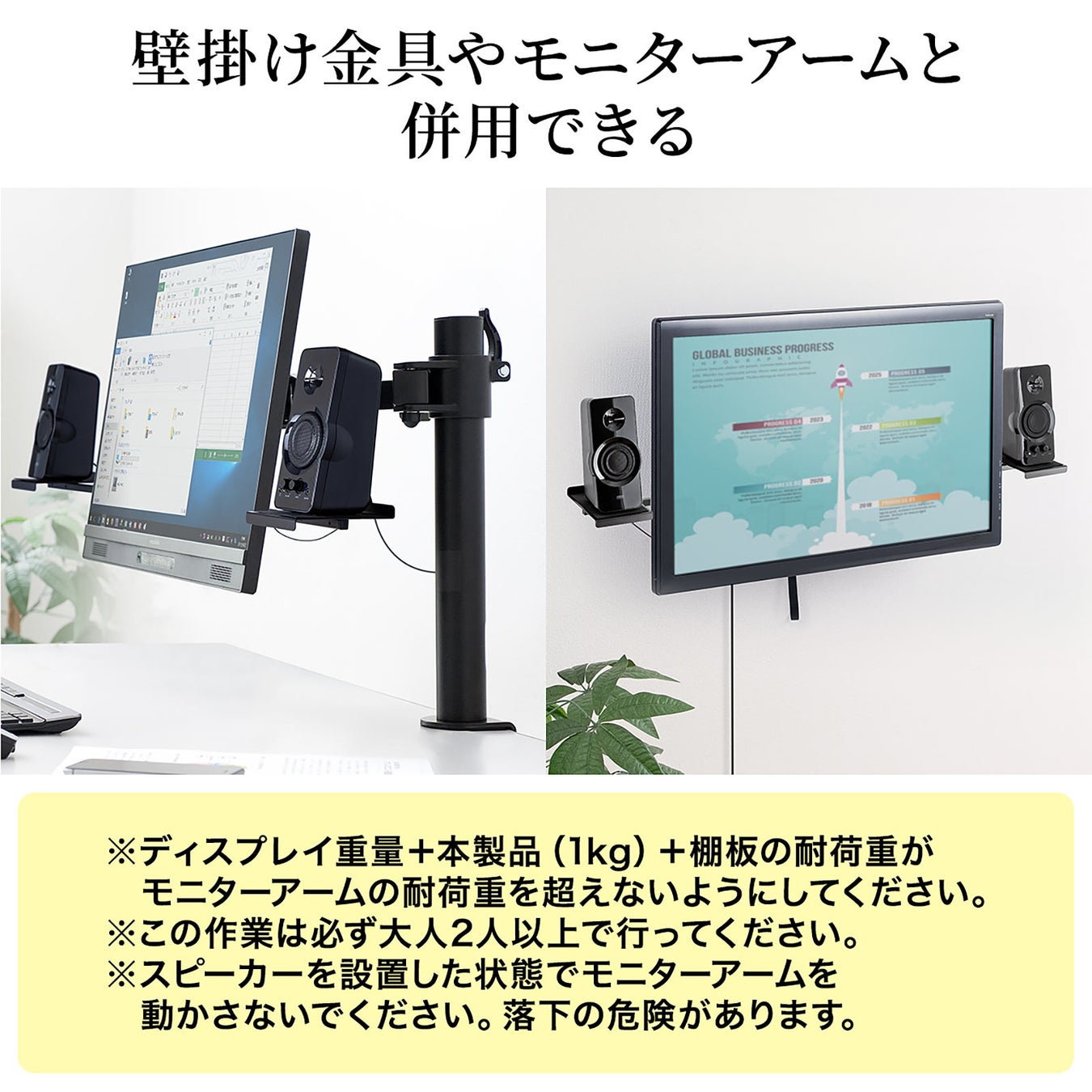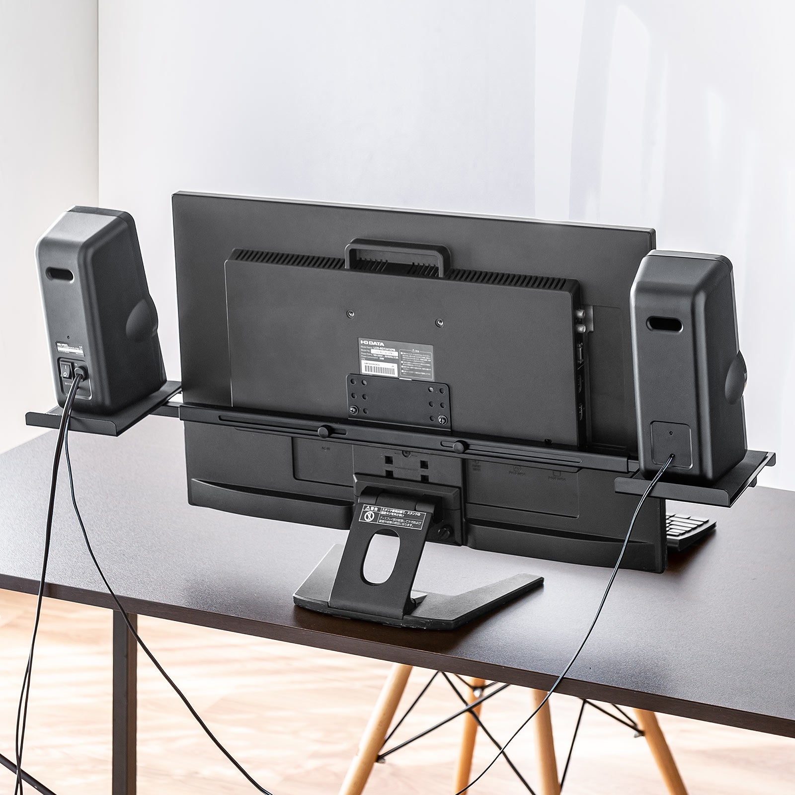 本製品は、パソコン用モニター背面に装着できるスピーカースタンドです。