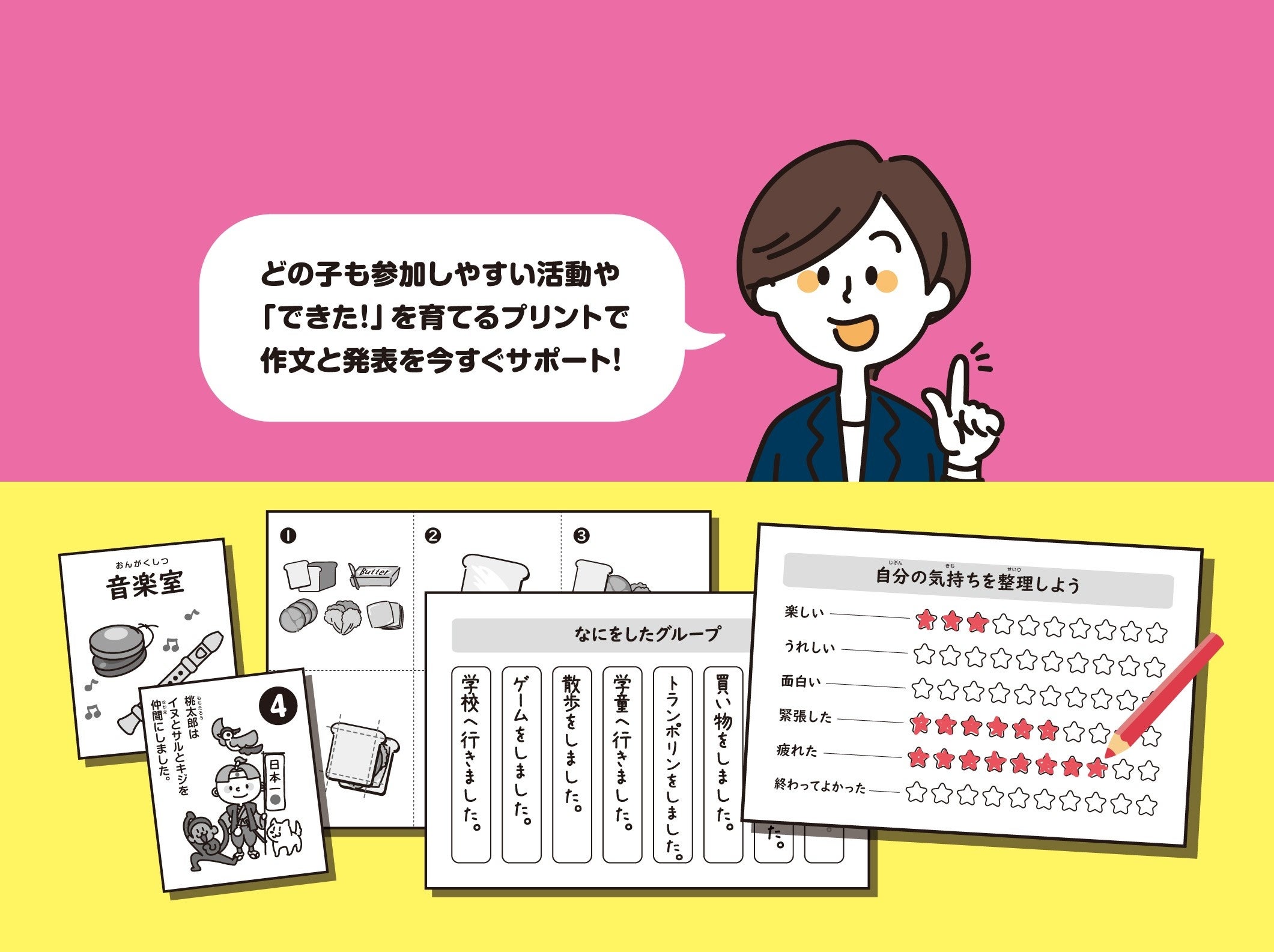 「気持ちや感想を適切に表すのが難しい」・・・などの様子が見られる子も参加しやすい活動や、「できた!」を育てるプリントで、作文と発表を今すぐサポートできる本ができました!