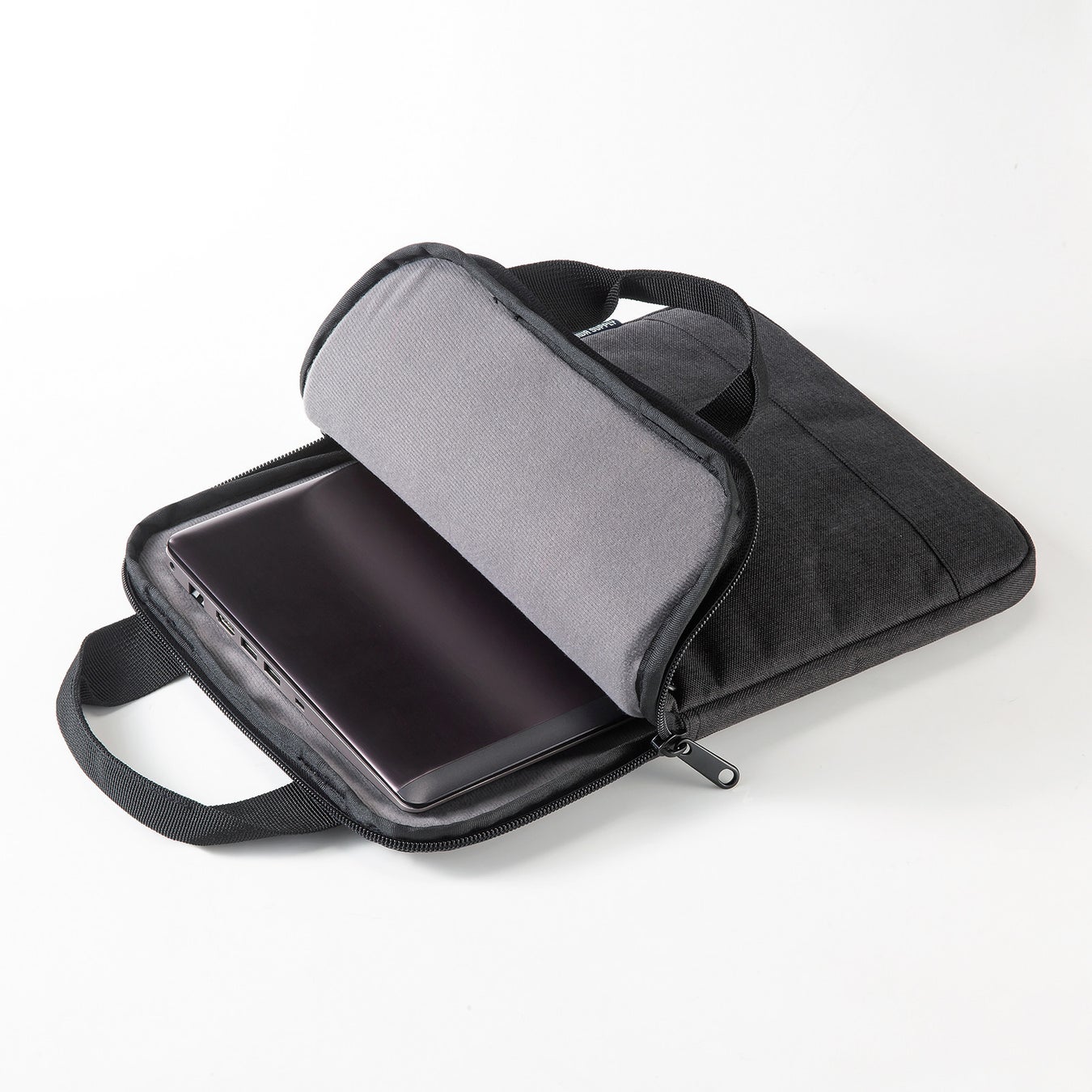 11.6インチまでのノートパソコンを収納することができ、内装は柔らかい起毛素材なので、ノートパソコンの表面に優しく収納時に機器をしっかり守ります。縦長の形状なのでリュックやランドセルに入れやすい形状になっています。