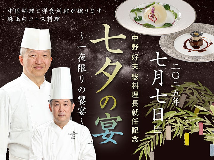 本イベントは、長年にわたり中国料理の世界で研鑽を積み、国内外のゲストに繊細かつ洗練された味わいを提供してきた総料理長・中野好夫と、本場フランスの名店での研修や料理コンクールでの経験を積んだ宴会料理長・池田徹によるコラボレーションでお届けする特別なコースです。前菜、スープ、主菜など、中国料理と洋食をパートごとに構成した一夜限りのコースを、七夕の夜にふさわしい特別な空間でお楽しみいただけます。