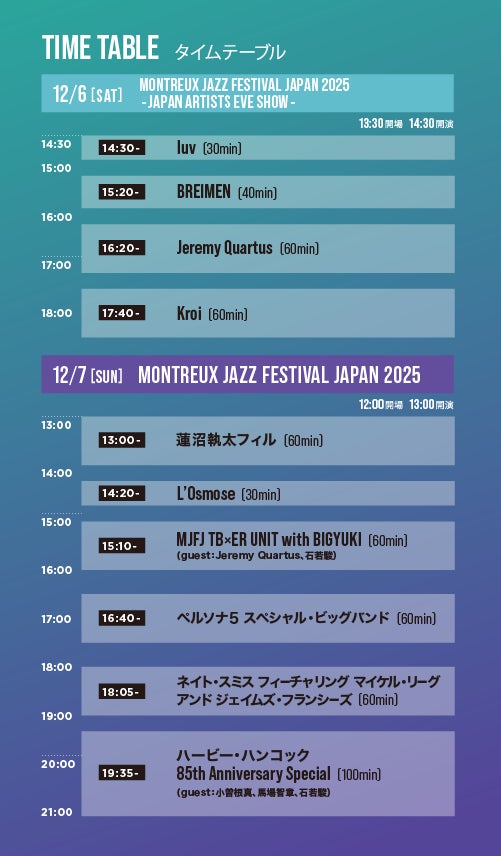 また、12月6日(土)・7日(日)の両公演共にタイムテーブルが解禁となりました。メインアーティストとなる、ペルソナ5 スペシャル・ビッグバンド、ネイト・スミス フィーチャリング マイケル・リーグ アンド ジェイムズ・フランシーズ、MJFJ TB×ER UNIT with BIGYUKI(guest:Jeremy Quartus、石若駿)、蓮沼執太フィル、Kroi、Jeremy Quartusの、各出演時間は60分を予定。御年85歳を迎えたハービー・ハンコックは、ゲストを迎えての豪華セットリストで100分超えのアニバーサリーステージを披露。アーティストの魅力を存分に堪能できるフルステージをお楽しみください。