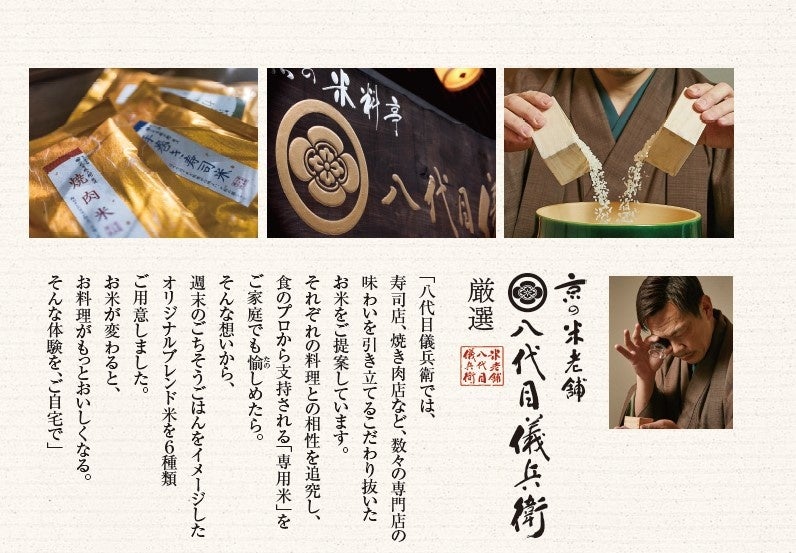 江戸時代・寛政の改革が出た年の創業以来、お米のおいしさを広めることを使命とし、革新的な挑戦を続けてきた八代目儀兵衛。現当主が究極の味わいを追求し、独自の手法でブレンドしたお米は、食のプロからも支持されています。