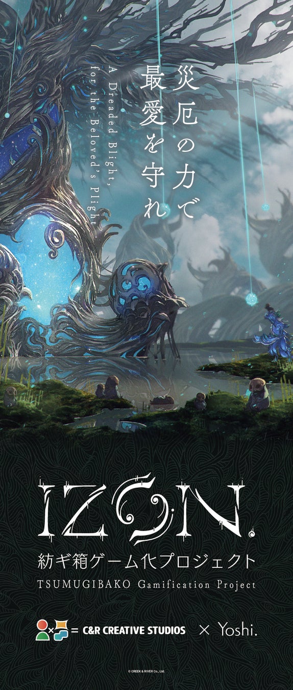 Yoshi.氏のオリジナルコンテンツ『紡ギ箱』をゲーム化した作品。退廃的で切なくも美しい世界を、破壊と創造の相反する力で切り開いていく共依存アドベンチャーゲーム(全12節)。ゲーム『IZON. 第1節封厄ノ塔』は今冬、オンラインゲーミングプラットフォーム「Steam」で発売予定*。