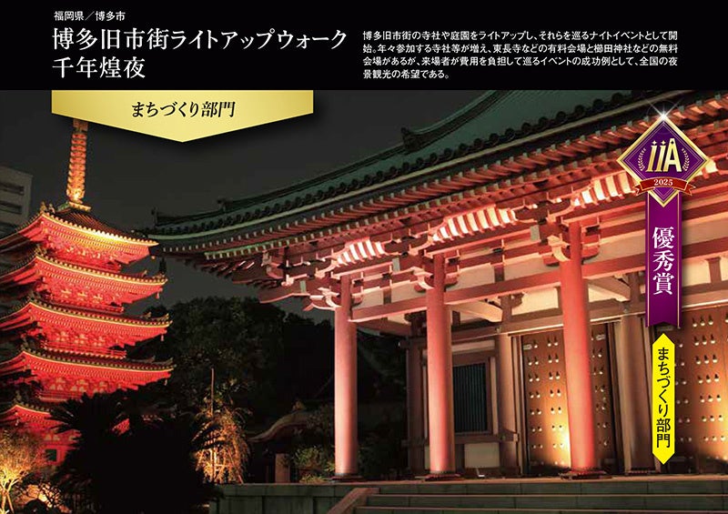 イルミネーション文化の新たな価値を世界に発信し、国際社会において日本がリーダーシップを取ることを目的とした新ブランドを発足。計6部門あり、「インターナショナル部門」「環境部門」「まちづくり部門」「テクノロジー部門」「クリエイティブ部門」の5部門は、各業界の審査員9名が決定、「イルミネーションイベント部門」は、全国6,768名の夜景観光士の投票で決定。そして今回もベスト・オブ・ベスト=最優秀賞も発表。