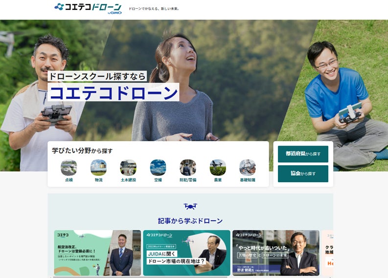 そうしたノウハウを基に、大変注目を浴びているドローンスクールの比較・検索が行えるサイト『コエテコドローン byGMO』を開設することといたしました。