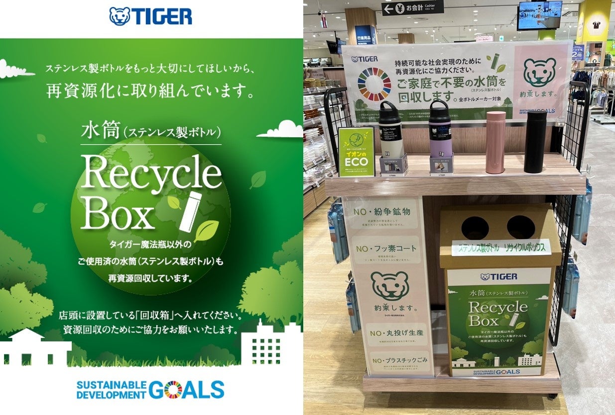 イオンリテールでは、資源循環型社会の実現に向けて、ペットボトルや日用品容器、衣料品など、お客さまとともに様々な資源回収に取り組んでいます。こうした中、タイガー魔法瓶の取り組みに賛同し、使用済みステンレス製ボトルの回収も推進していきます。