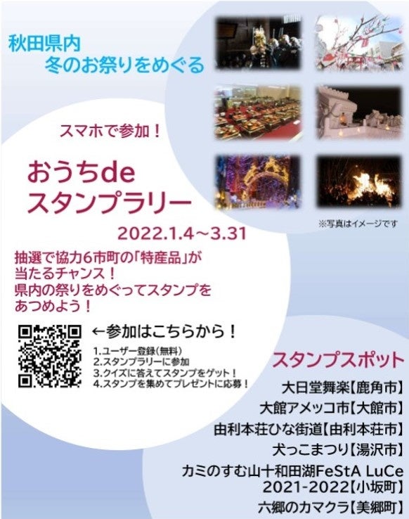 JAF(一般社団法人 日本自動車連盟)秋田支部(支部長 伊藤 哲充)は、1月4日(火)から3月31日(木)まで「秋田県内冬のお祭り~おうちdeスタンプラリー」を開催しています。