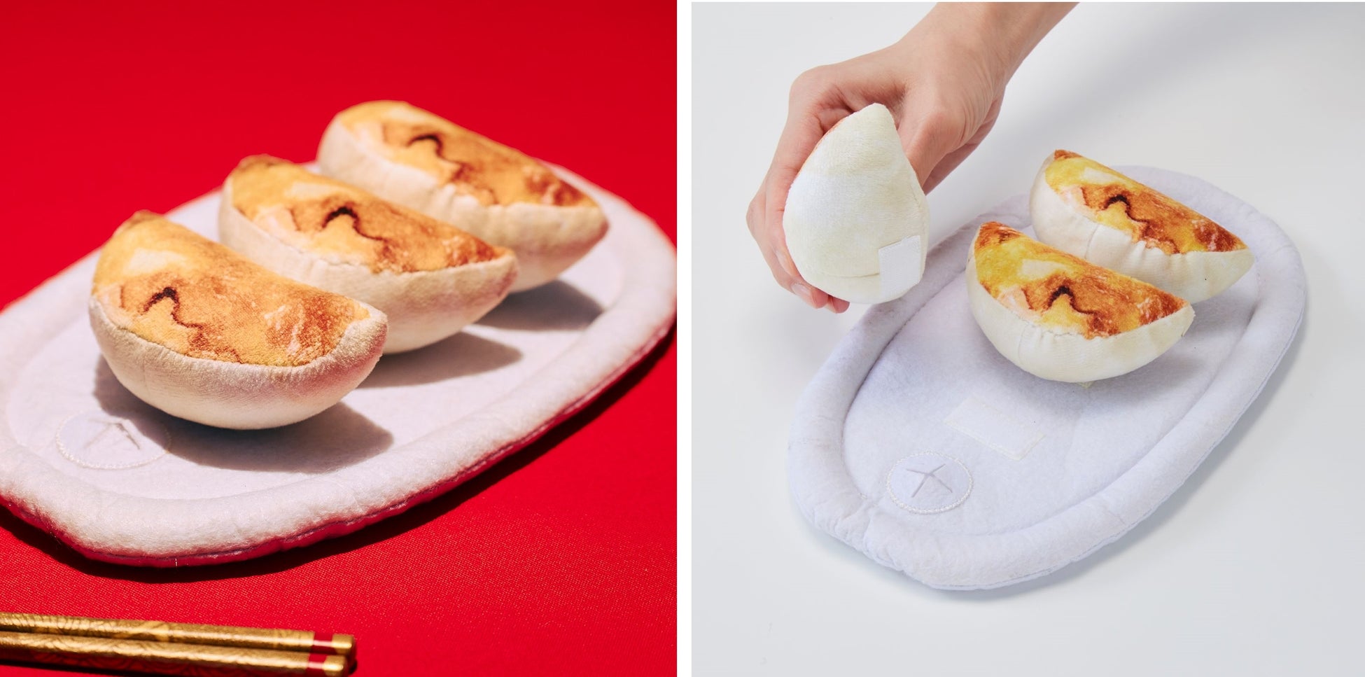 餃子の間やお皿のポケットにおやつを隠して、食べ物やにおいを探し当てて楽しめるノーズワークトイ。ぷりぷりの餃子は取り外して、単体でも遊べます。
