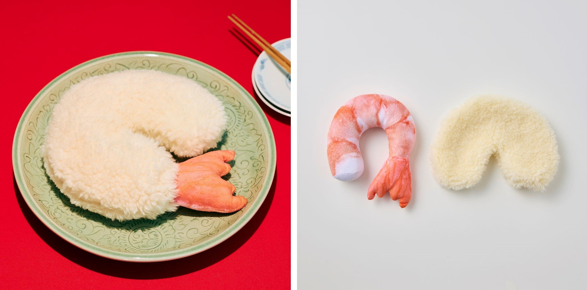 ふかふか素材が口でつかみやすく、遊んだりからだを預けるのにちょうどいいサイズ感。えびのカーブがあご乗せや枕として、ほどよくフィット。衣を取ればリアルなえびが現れます。