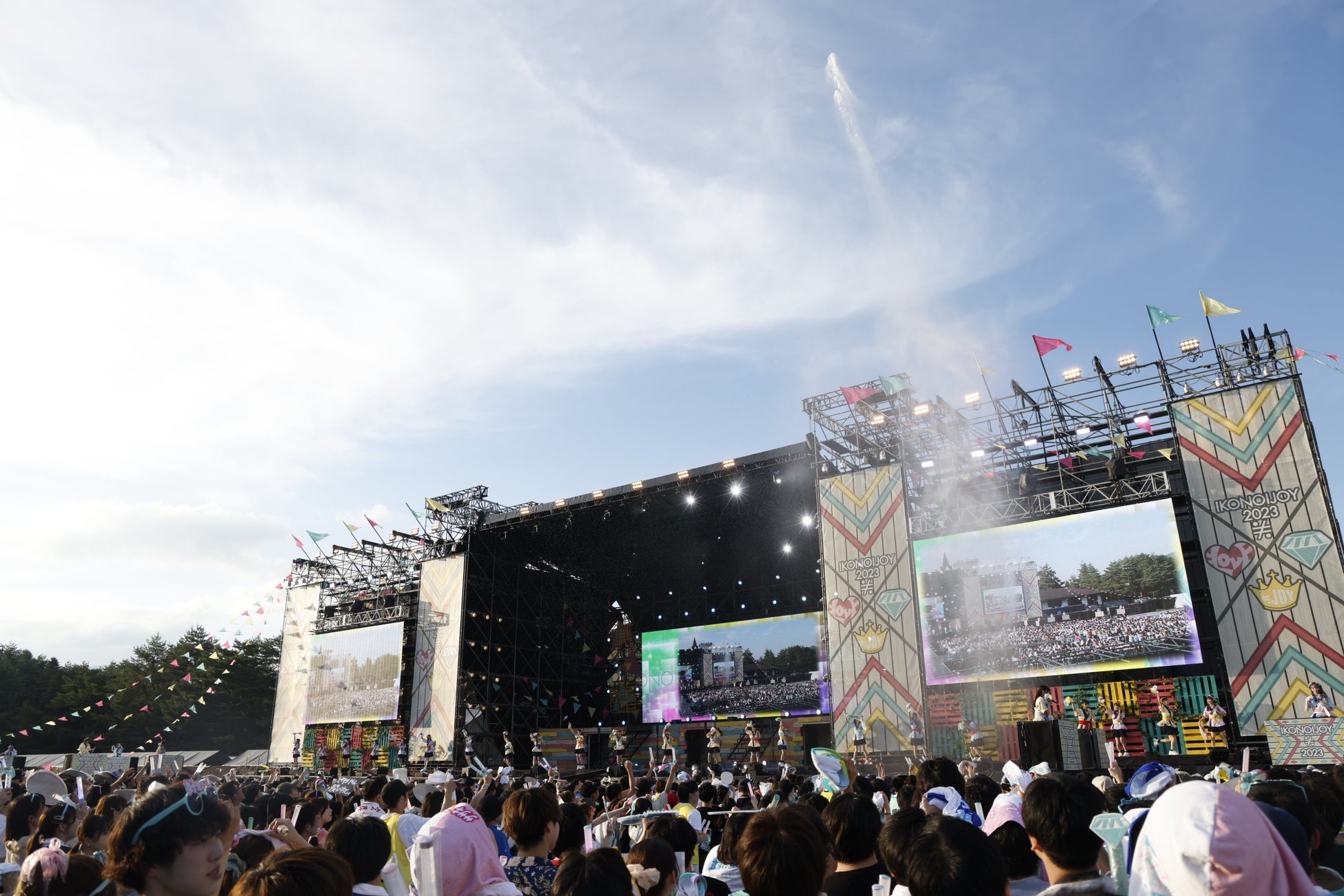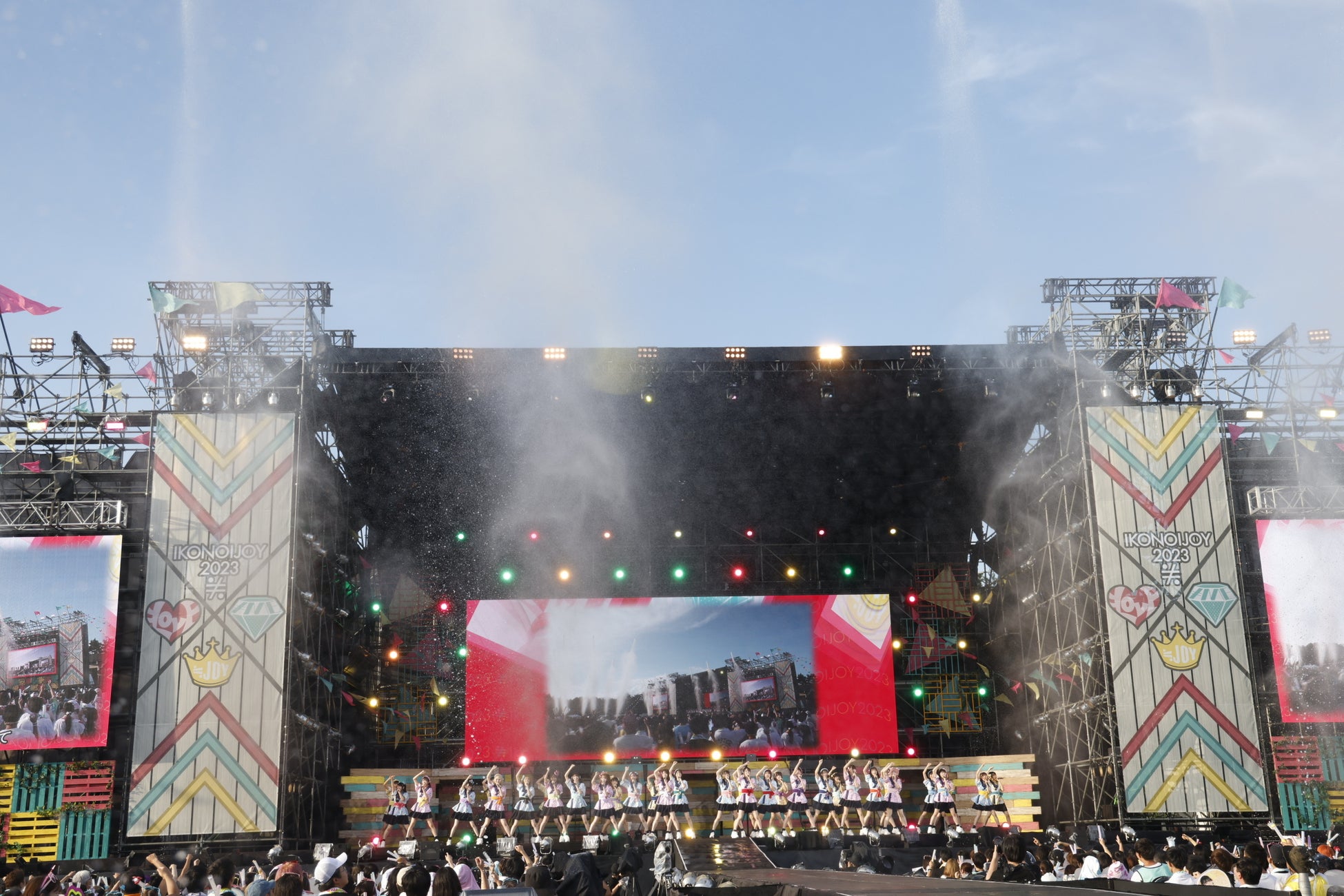 3グループそろっての特別なライブが繰り広げられる夏の合同フェス「イコノイジョイ 2023」。今年は昨年に続く2回目の開催で、初の2DAYS公演へと規模が拡大された。初日公演「うぉーたー&あわあわパーティー」では水や泡を使った演出が展開されたが、本日の2日目の公演は「シャッフルパーティー」と題し、3グループがメンバーをシャッフルして楽曲を披露するなどレアなパフォーマンスが盛りだくさんに。初日同様に約1万人のファンが会場に集まり、声出し可能な野外ライブを思い切り楽しんだ。