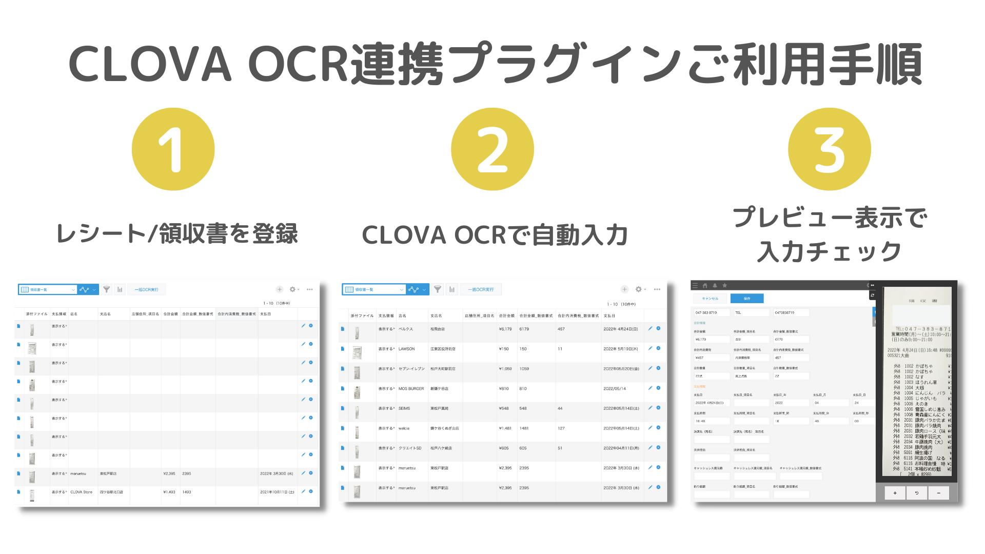 ※本プラグインの利用には、「CLOVA OCRプラグイン」、「kintone」、「CLOVA OCR」(レシート・領収書特化型、請求書特化型)APIの各契約が必要となります