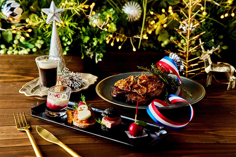 コースのスタートは、つい「カワイイ!」とはしゃいで会話を盛り上げるようなクリームチーズでスノーマンをあしらったブルスケッタや、ドライフルーツとフォアグラを閉じ込めた真っ赤なリンゴを模したボンボンなどをご用意。このほか、サーモンとアボカドの各々が持つ素材の滑らかな食感が溶け合うようなタルタルが前菜で楽しめるほか、柔らかな牛ヒレ肉を程良くグリルし、卵黄とバターの濃厚でコクのあるソースが牛ヒレ肉の旨みを引き出すメインディッシュなどが堪能していただけます。また、特別な一夜の印象に残るよう、星型スタンドやお皿のデザインも特徴的なものを選び、会話が弾んでしまうような遊び心や彩りを添えているので、カップルなど大切な人と過ごすにはぴったりの全5品のコースです。