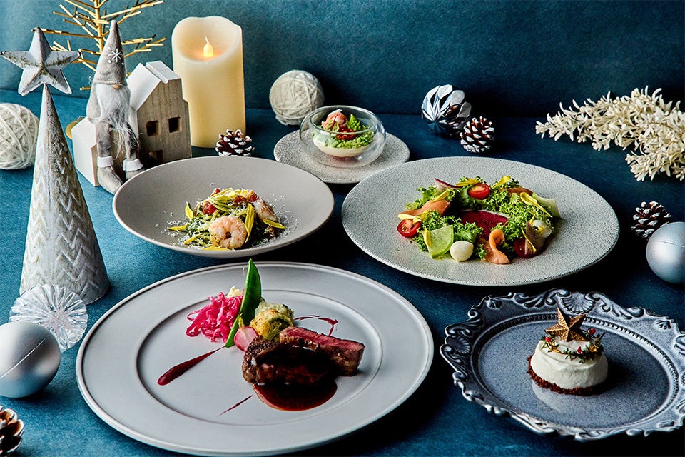 賑やかにローストチキンを頬張りながら大人数で楽しむクリスマスパーティーをイメージしたコース。コースを盛り上げるドリンクは飲み放題でご用意し、クリスマスの煌びやかさを演出できる乾杯にぴったりのスパークリングワインをはじめ、ミモザやキールロワイヤルなど豊富なアイテムが揃います。料理では、リースに見立てたスモークサーモンとチーズのサラダや、パスタをジェノベーゼ風味にし、海老やトマトを添えることでクリスマスツリーに見立てた品々のほか、ジューシーでほろほろな肉質の富士高原どりのローストチキンなどシェフからのクリスマスプレゼントのような見た目にも遊び心が詰まった品々がご堪能いただけます。