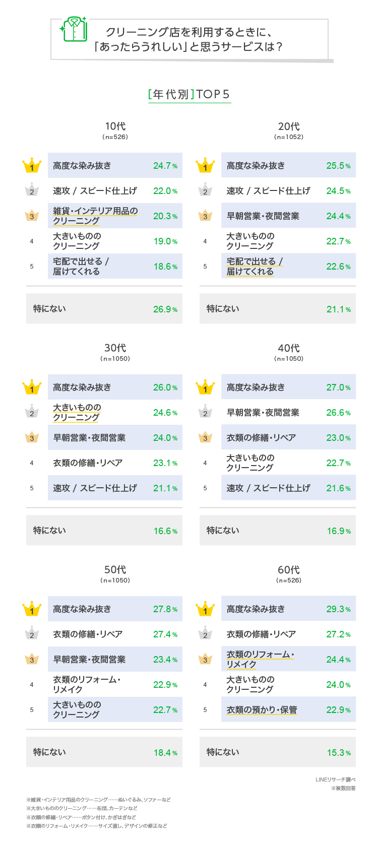 年代別にみていくと、10~20代では「速攻 / スピード仕上げ」が2位にランクイン。また、10代では「雑貨・インテリア用品のクリーニング(ぬいぐるみ、ソファーなど)」がランクインし、特に10代女性で3割弱となっています。