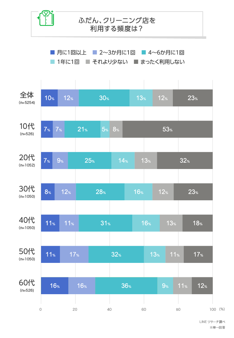 このたびLINEリサーチでは、日本全国の男女を対象に、クリーニング店を利用する頻度や、クリーニング店にあったらうれしいサービスについて調査しましたので、その結果をお知らせいたします。