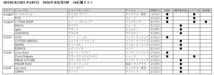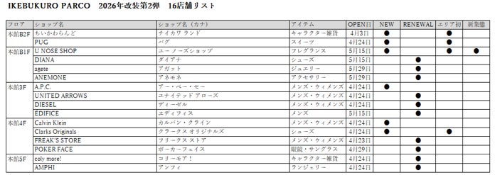 池袋PARCO 2026年NEW&RENEWAL SHOP 一覧