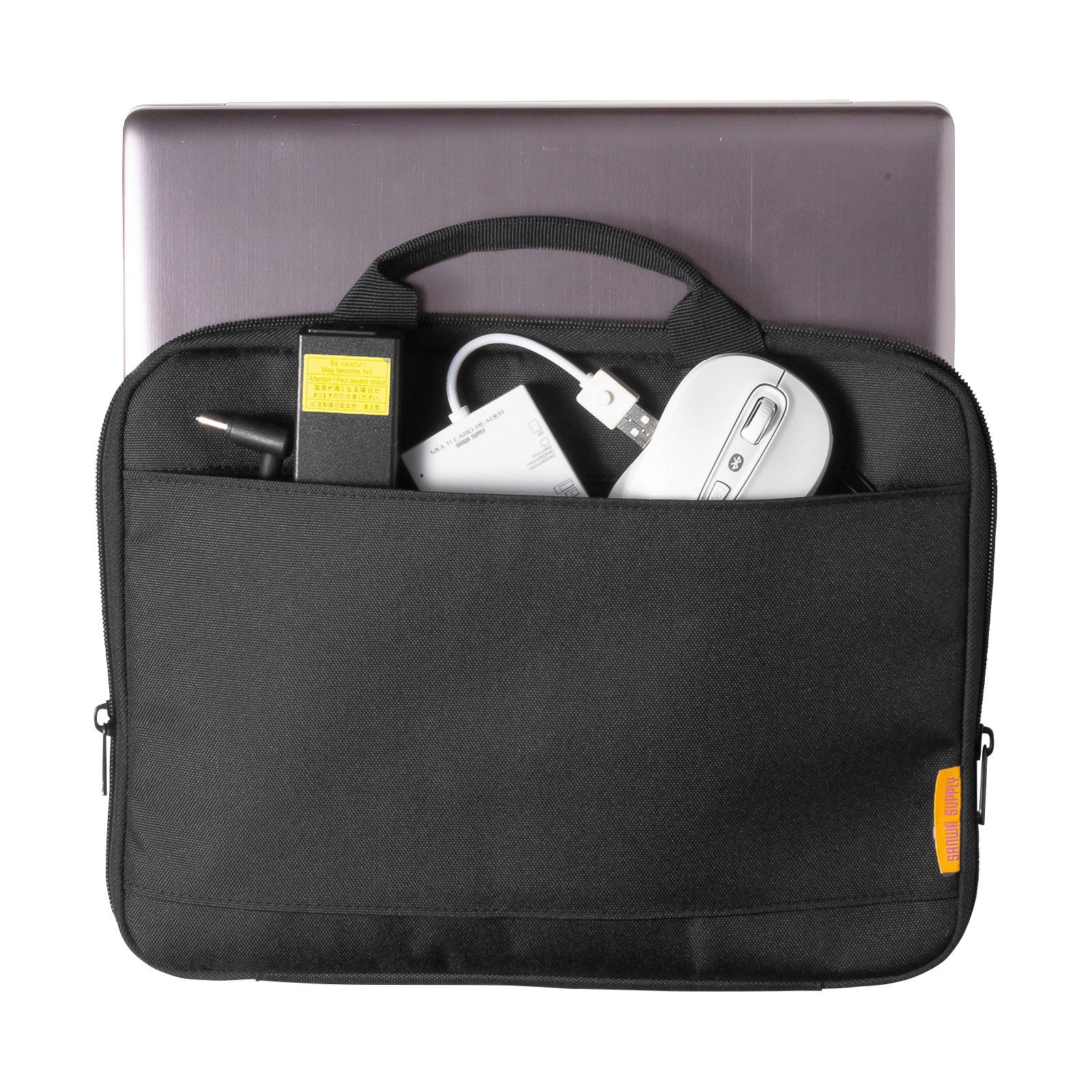ケースのフロントにはマウスやACアダプタどを収納できるポケットがついており、持ち運びの際にノートパソコンと周辺機器の接触を防げます。