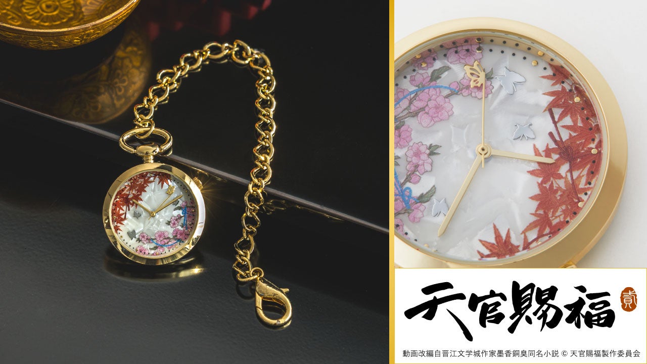 謝憐、花城をイメージした桃の花と楓、その間を舞う銀色に輝く死霊蝶が美しいチャームウォッチです。懐中時計のようなクラシカルなシルエットに、シェル風の文字盤、小さな蝶が羽ばたく秒針など、上品なデザインに仕上げられています。チェーンタイプなので、バッグやポーチなど、どこにでもさっと取り付けられ、小ぶりながら存在感のある美しさで外出先でも作品の世界観を堪能できます。裏面には「天官賜福 貮」の刻印もあり、ロゴが箔押しされた専用のボックスに入っています。