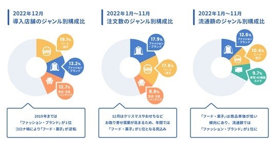 ・2020年以降、「フード・菓子」ジャンルが導入店舗トップシェア。注文数も「フード・菓子」が急増、流通額では「ファッション・ブランド」が1位。