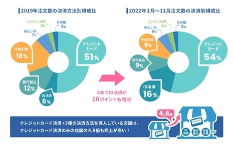 ・ID決済の注文割合が3年で10ポイント増の急成長。複数の決済方法を導入している店舗のほうが高い売上に。