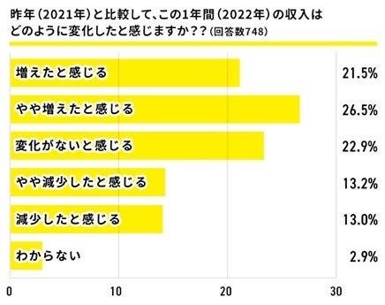 「やや増えたと感じる」の回答が最も多く、「増えたと感じる」と合わせると約半数が2022年には収入の増加を実感していることがわかりました。