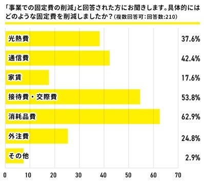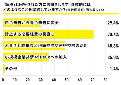 それ以外の「節税」「事業での固定費の削減」「案件単価や受注数の見直し」など、事業に関わる回答は、ほぼ同じ数値で並びました。「節税」においては「計上する必要経費の見直し」に次いで、「ふるさと納税」などの税額控除や所得控除を活用する人も目立ちました。「事業での固定費の削減」については「消耗品費」「接待費・交際費」を削減している人が多いことがわかりました。