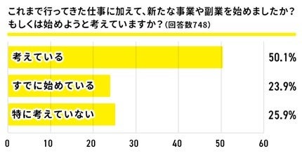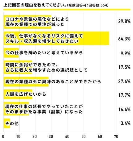 このように、会社員と比較して収入が変化しやすいフリーランスの中には、収入安定をめざして副業をする人もいるでしょう。これまでの仕事に加えて、新たな事業や副業を検討しているかを聞いたところ、半数以上が「考えている」と回答。「すでに始めている」という回答と合わせると7割を超え、理由としては「今後、仕事が減少するリスクに備えておきたい」という声が目立ちました。