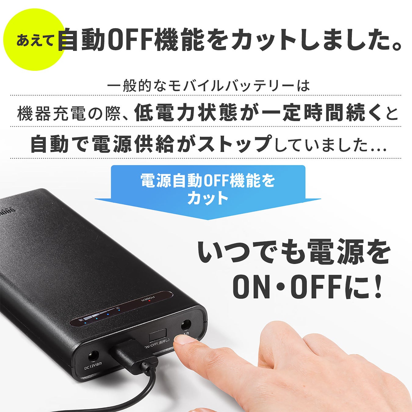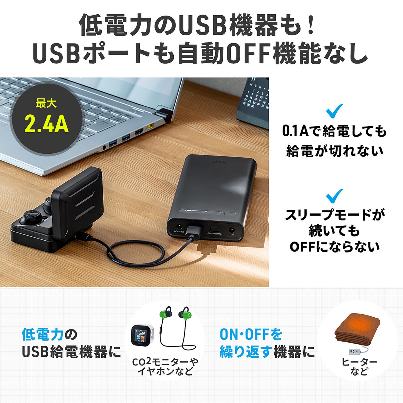 低電力時でも自動OFFせずに連続給電に対応しています。