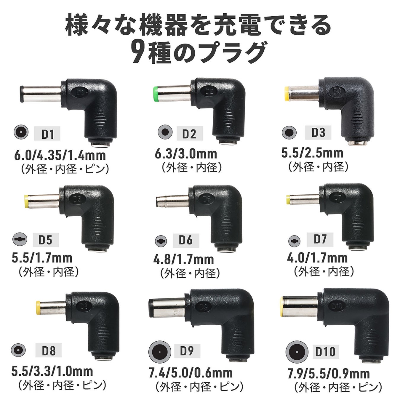 各種DC12V機器に対応した9種類の変換プラグ付属しており、省スペースで取り回ししやすいL字プラグを採用しています。