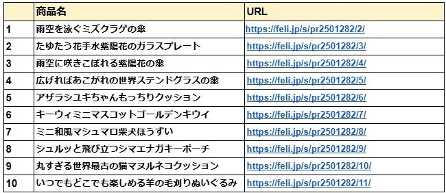 フェリシモは、ユーモア雑貨ブランド「YOU+MORE!(ユーモア)」のグローバルサイト人気商品トップ10を本プレスリリースにて初めて発表します。日本でのシリーズ累計販売数が72万本を突破した「雨空を泳ぐ ミズクラゲの傘」が1位に輝いたほか、紫陽花、羊、あざらしなど、生き物とお花をモチーフにしたユニークアイテムがランクインしました。グローバルサイトの訪問者数最多国である台湾のお客さまからは「ユニークなデザイン」「秀逸なクリエイティブで魅力的」「デザインセンスがすばらしい」などの声をいただいています。商品について「かわいい!おもしろい!」と関心を持ってくださったのち、企画担当者たちの各モチーフへの愛が溢れるストーリーに惹かれてブランドのファンになってくださるリピーターも多く、リアリティを追求する企画への姿勢も「日本ならでは」として評価されていることがわかりました。ファッション、生活雑貨、手作りキットなど幅広いカテゴリーを取り扱うフェリシモ全体のランキングでも上位10商品のうち7商品がYOU+MORE!のアイテムです。昨年6月に開催したフェリシモのポップアップショップにも行列ができるなど、現地での認知も拡大している様子が見受けられます。
