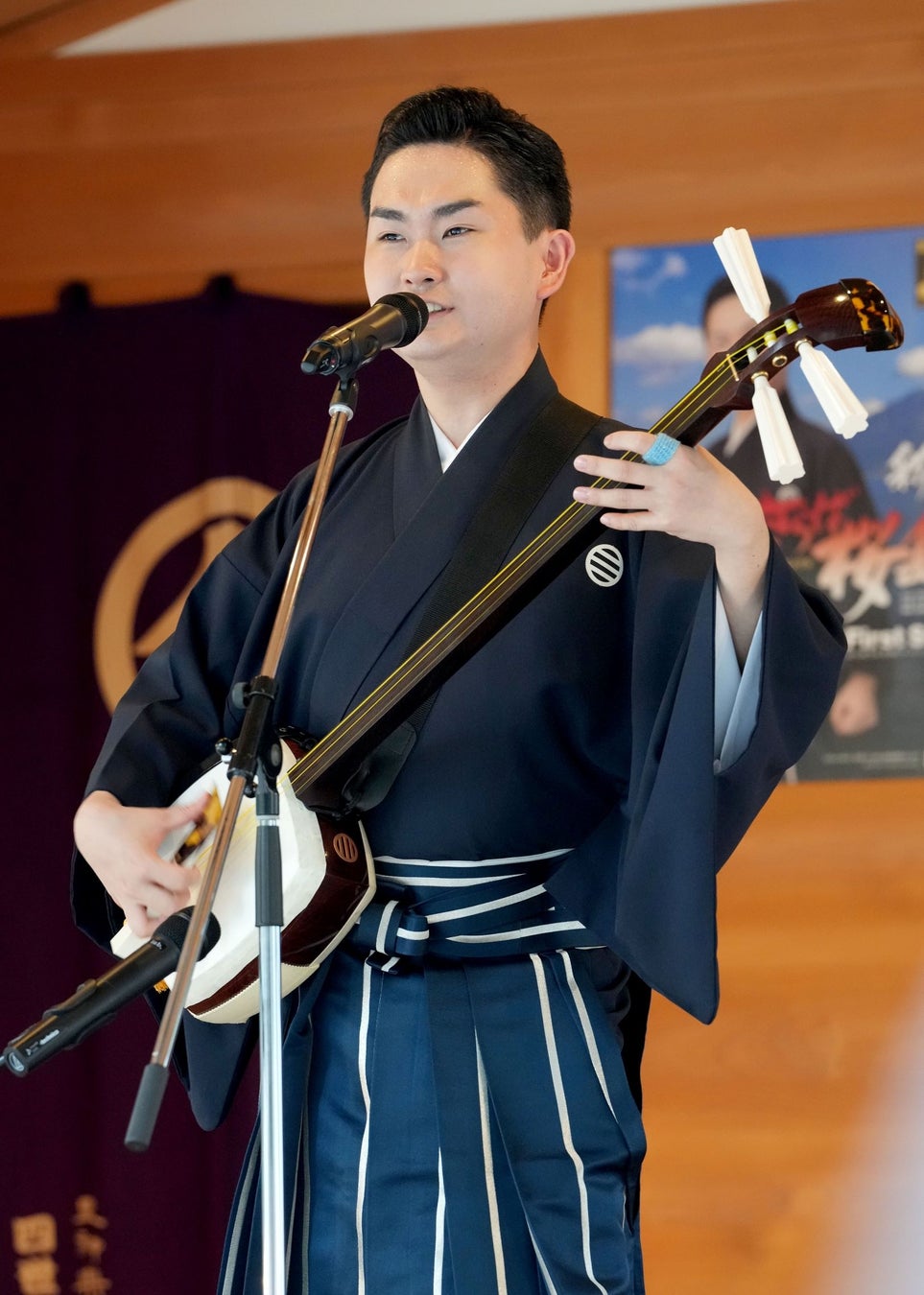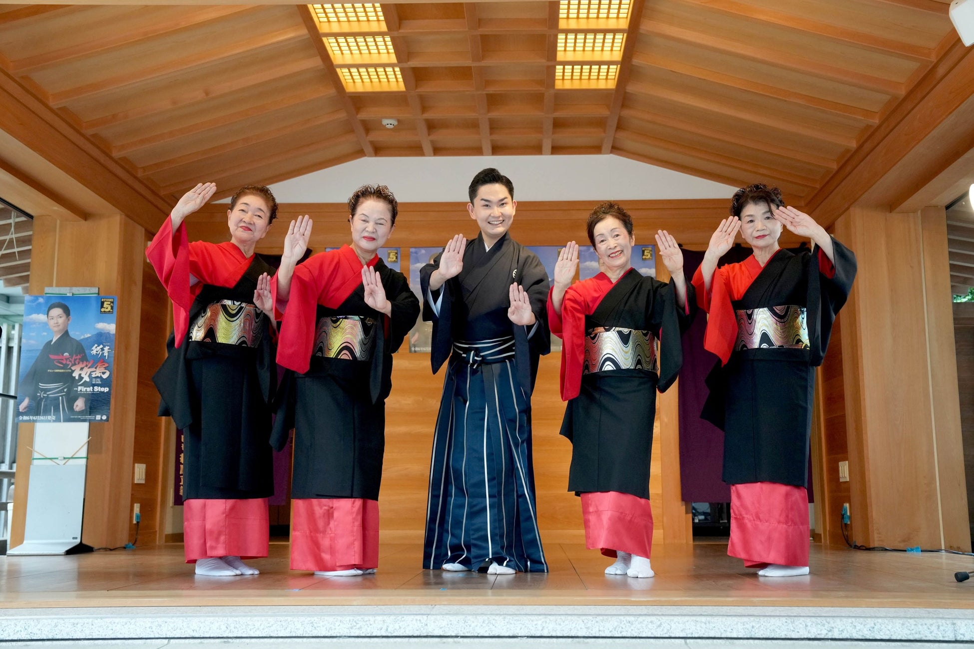 神楽殿前には、報道陣だけではなく、熱烈なファンも大勢詰めかける中、「今日は、〝三刀流歌手〟として歌に尺八、三味線とお楽しみください」と呼びかけ、尺八を吹きながら股旅演歌のデビュー曲「銀次郎 旅がらす」(2019年6月26日発売)をはじめ、ニューシングルのカップリング曲で初のJ-POPソング「First Step」、津軽三味線に持ち替えて、力強い曲弾きを交えながら第2弾シングル「津軽三味線ひとり旅」、5歳から始めた民謡から「関東さつま南の会」の踊りをバックに「鹿児島おはら節」を披露し、最後に新曲「さらば桜島」の全5曲を熱唱した。