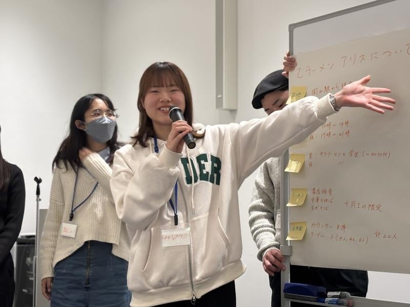 乙ラーメンアリスからは、学生が来店しやすいラーメン店舗の条件がテーマとして提供され、学生は、外観の印象づくりや動線を整えること、待ち時間の見える化を行い安心感につなげることなど、来店の心理的ハードルを下げる具体案を示しました。