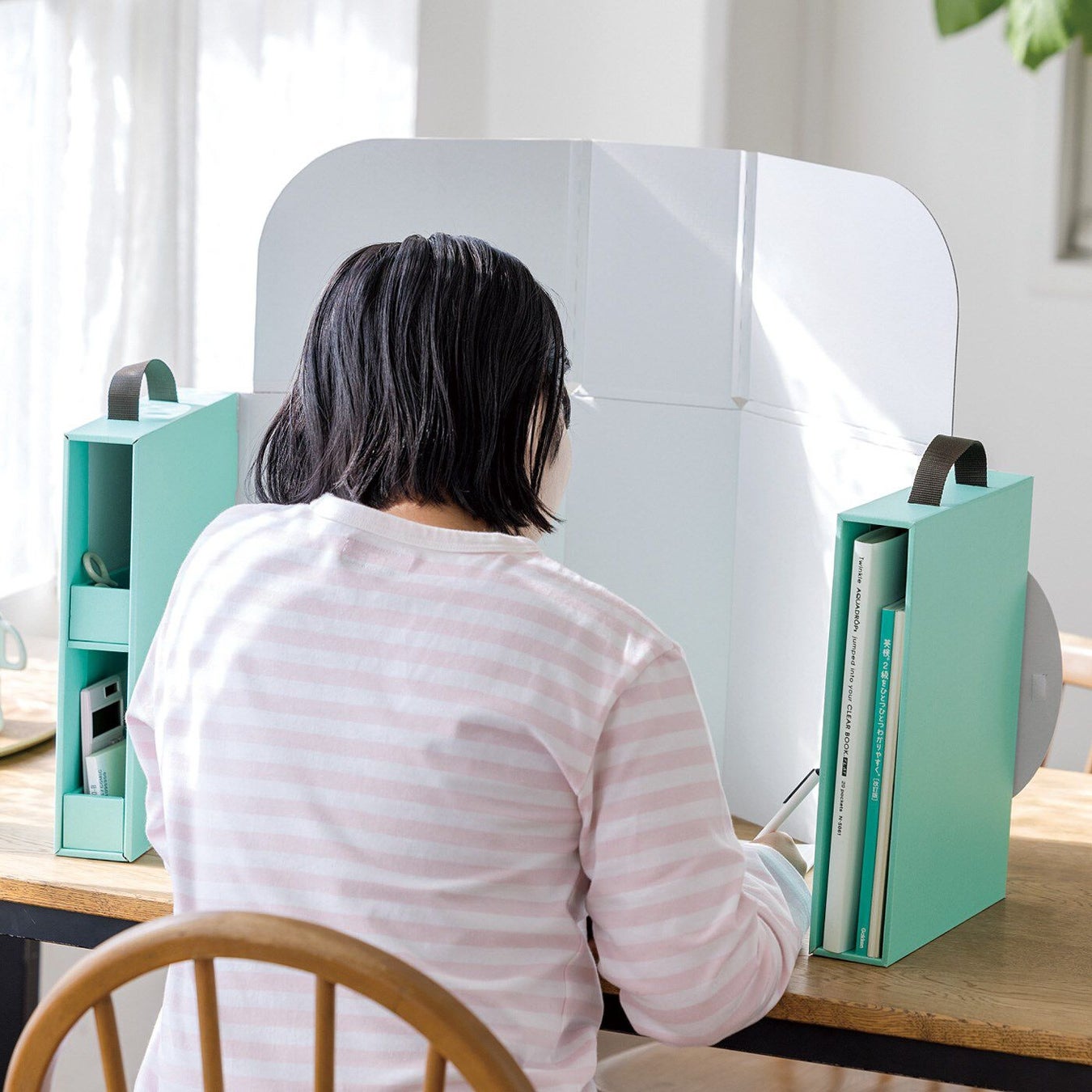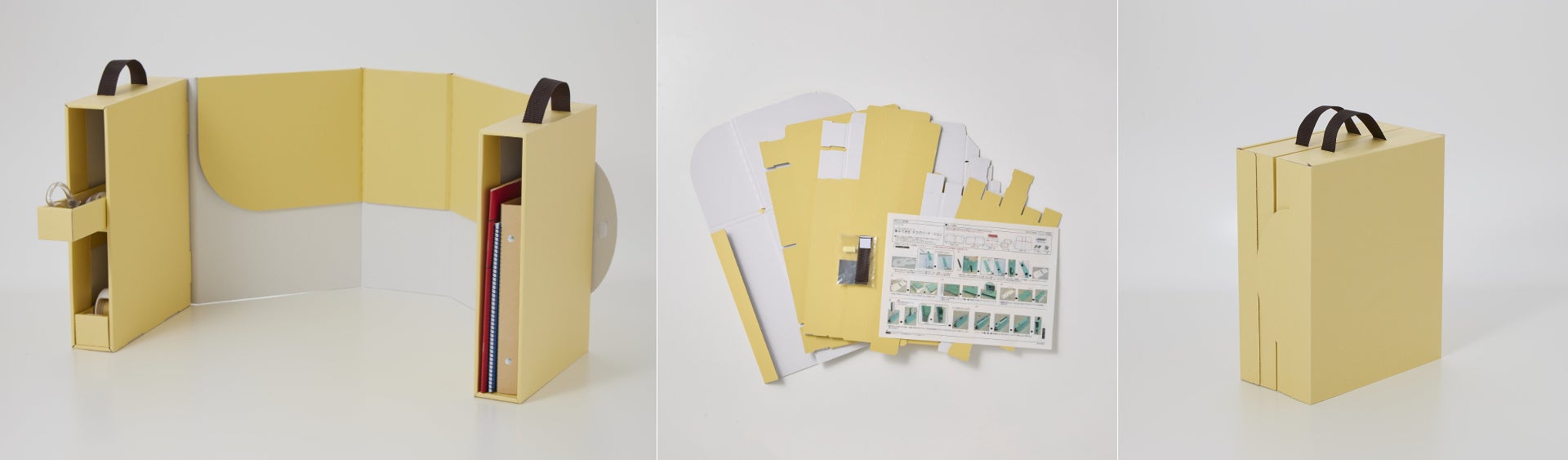 リビングなど気が散りやすい場所でも集中できるデスクパーテーションがリニューアルして登場です。高さも変えられる折りたたみ式になって、A4サイズも入る収納スペースが正面から両サイドに移動。見た目もスッキリしてより安定感のあるデザインに仕上げられています。テレビや周囲の様子が視界に入りにくく、折りたたんで持ち運びもできるので、自分だけの空間が好きな場所に簡単に作れます。集中している本人だけでなく、周囲の人も気遣いなく過ごせるのもポイントです。デザインは〈クリームイエロー〉〈ターコイズブルー〉の2種類です。自分で組み立てるタイプのほかに、就労支援継続B型事業所「ハッピーエリア」で組み立ててお届けする〈組み立て済み〉もあります。