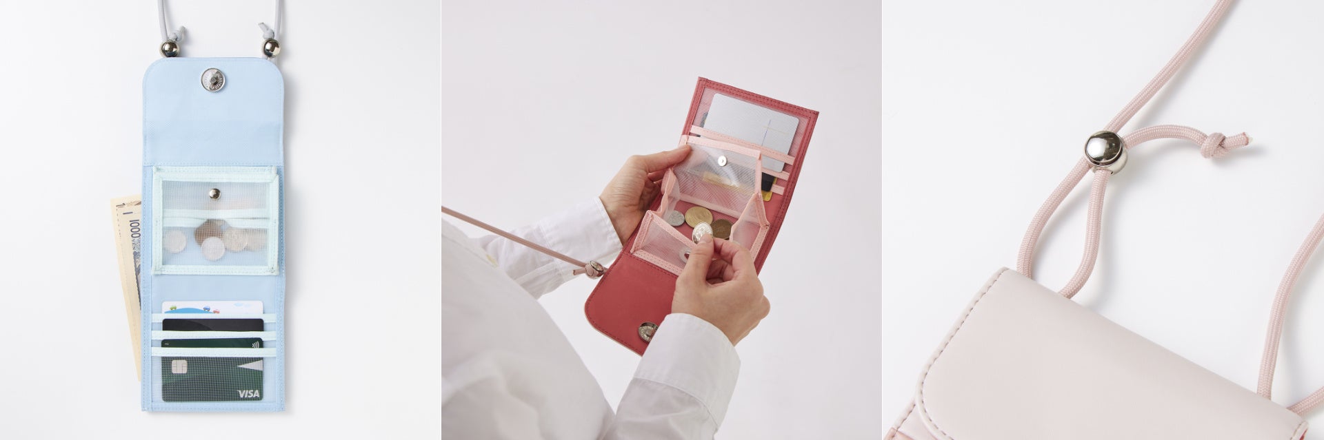 中にはコインケース、カード入れが3枚分と、お札も入ります。メッシュ素材のポケットで、カードなど中身が一目瞭然。ひもの長さが調節できて、斜め掛けもできます。