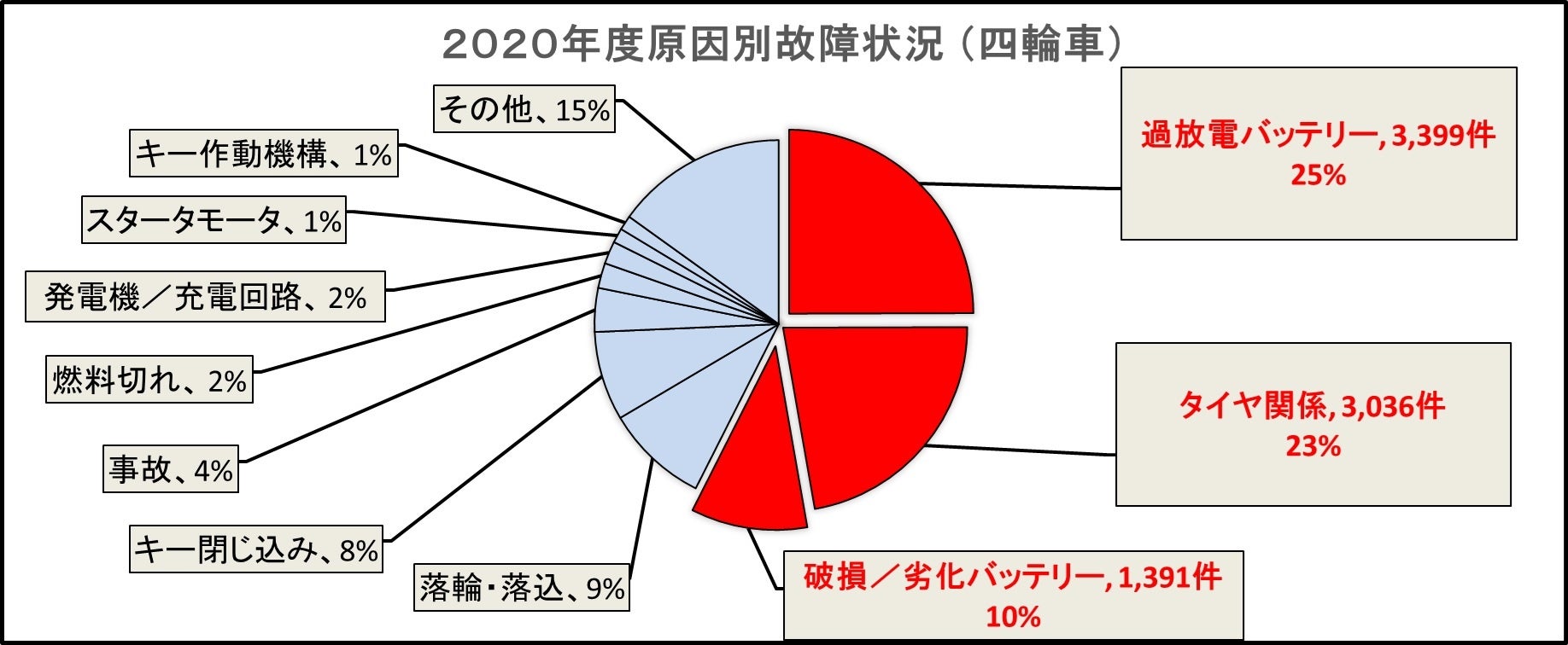 JAF徳島支部のロードサービス救援要請では、バッテリーとタイヤ関係のトラブルが全体の50%以上を占めます。日頃からクルマのコンディションをチェックする「日常点検」をおこなうことでトラブルを回避し、より安全にクルマを運転することができます。