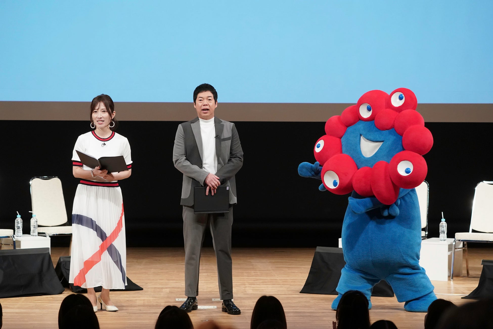 イベント冒頭では、司会の今田耕司、亀井京子とともに、大阪・関西万博公式キャラクターのミャクミャクが登場。イベントを主催する一般社団法人チーム関西を紹介した後、さっそく、万博の大きな課題について触れます。