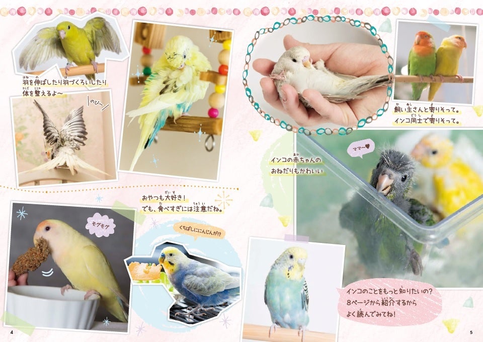 解説ページには、さまざまな種類のインコの写真が満載。思わずなでなでしたくなるかわいさです!