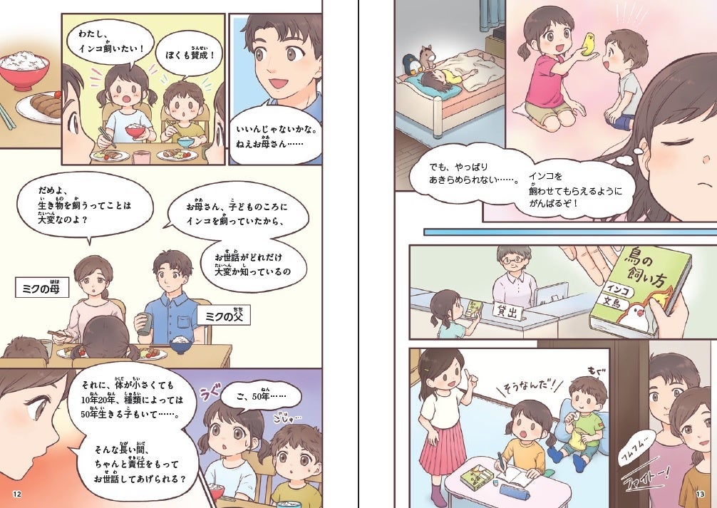 家庭内でのお世話の分担やコミュニケーションのとりかた、命をあずかる責任など、子どもたちに伝えたい大切なテーマもしっかりとおさえています。